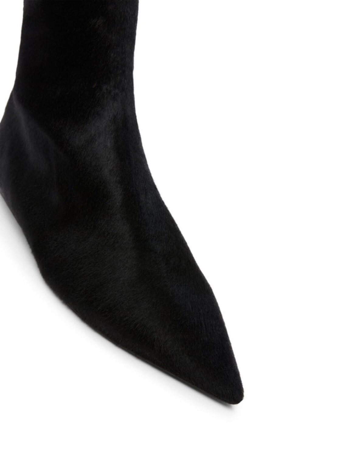 Конский волос, заостренный носок, застежки на молнии сбоку, кожаная стелька с логотипом, плоская резиновая подошва и высота по щиколотку.