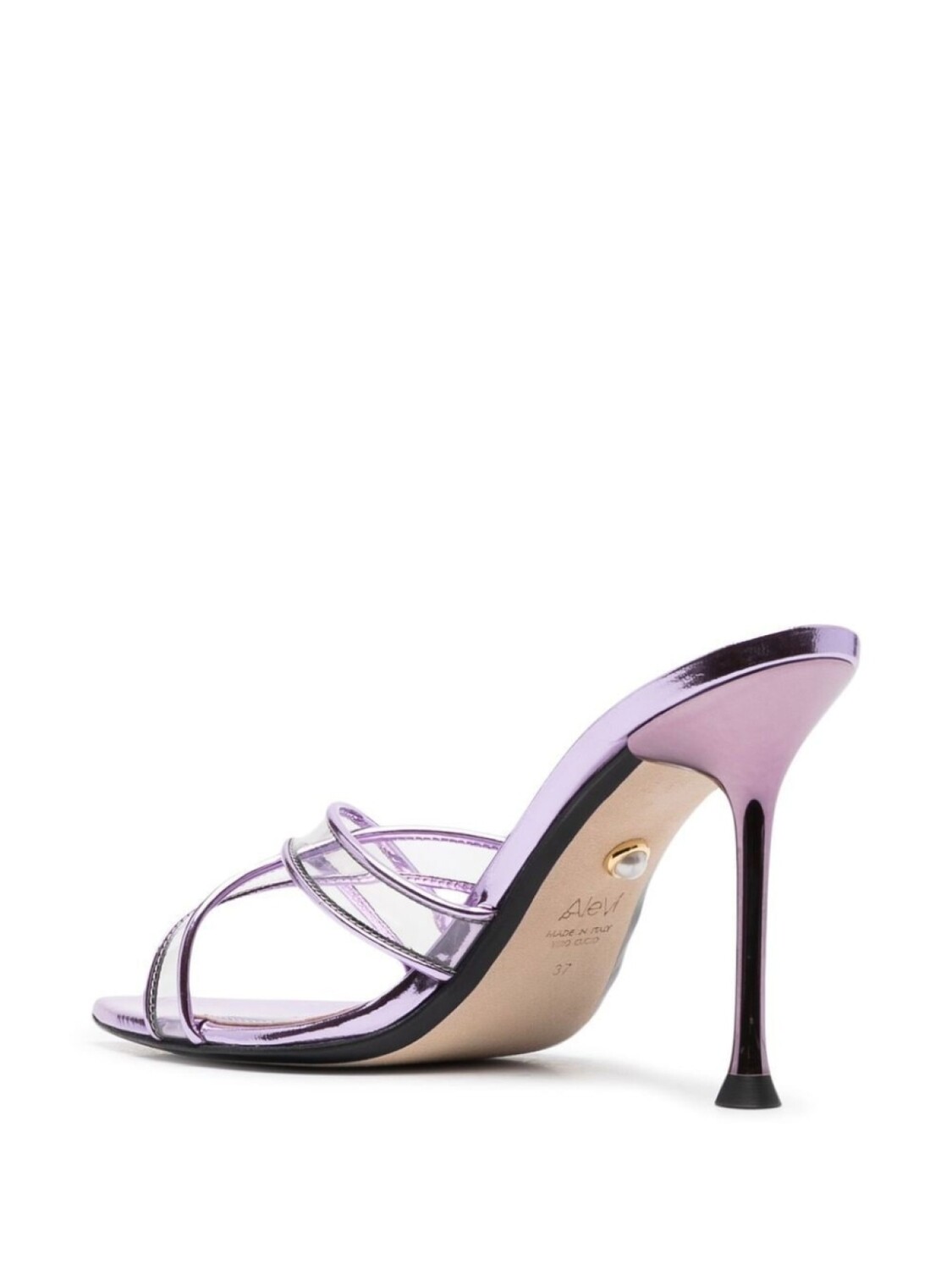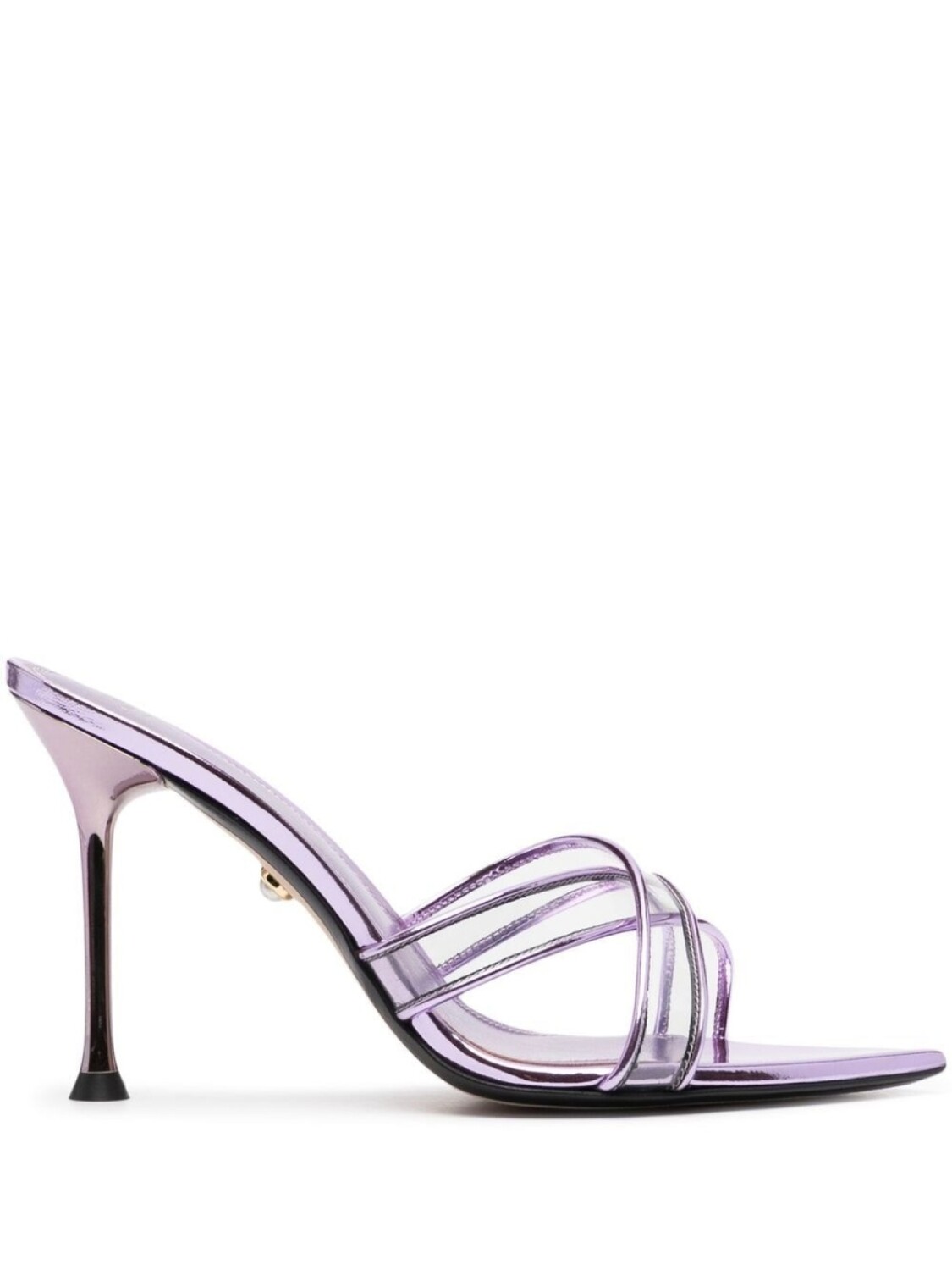 Фиолетовый, телячья кожа, эффект металлик, перекрестные ремешки, открытый носок, заостренный носок, открытая спина, логотип на стельке и каблук на высокой шпильке.