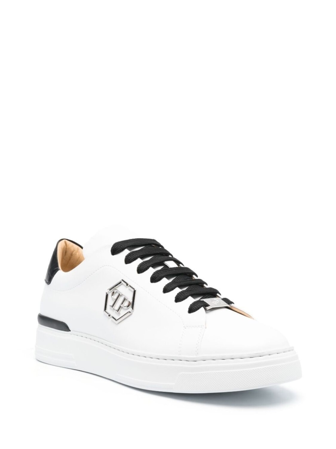 Белый, телячья кожа, закругленный носок, металлический логотип, серебристая фурнитура с выгравированным логотипом, контрастный задник, шнуровка спереди, стелька с логотипом и плоская резиновая подошва.