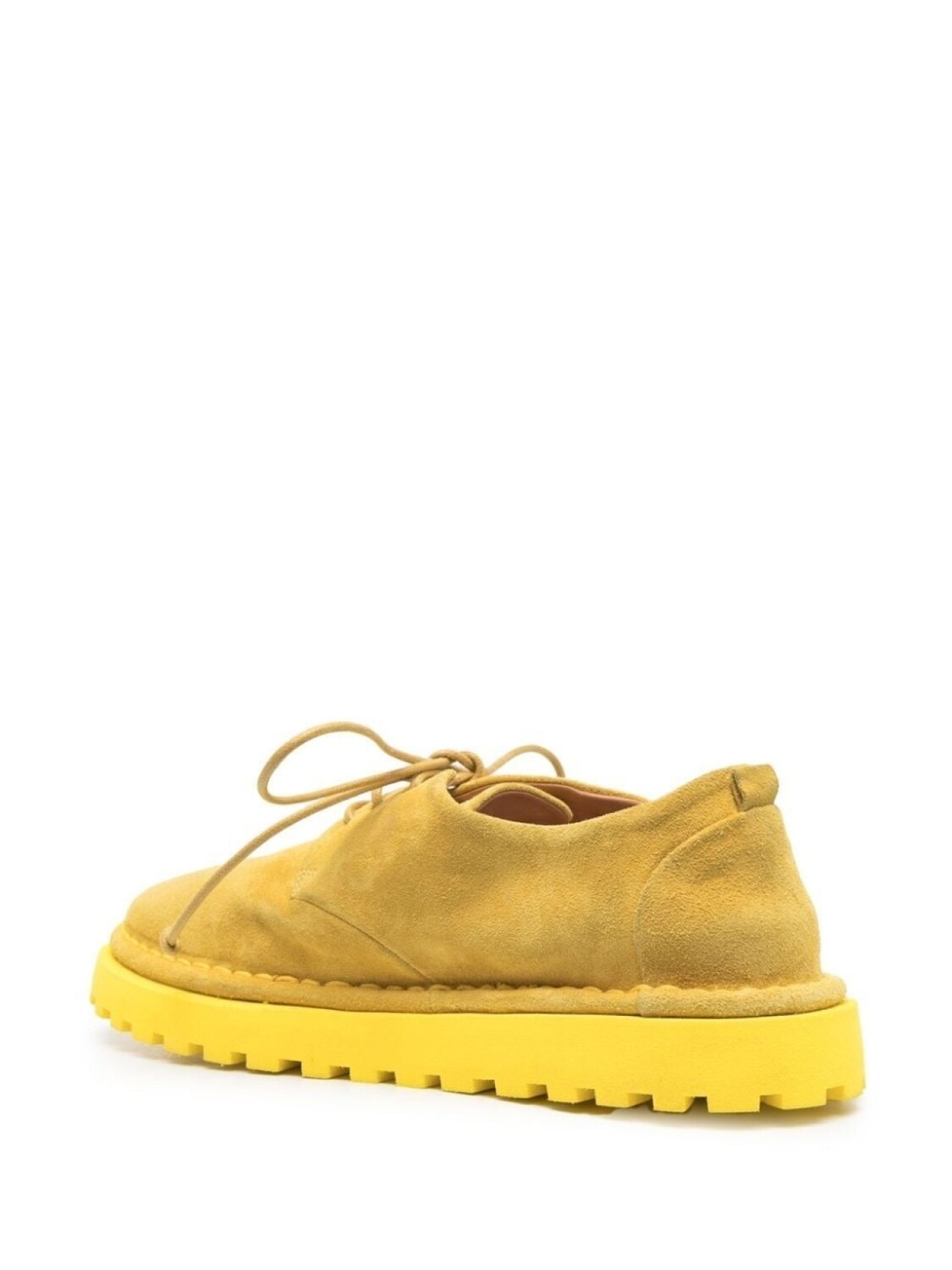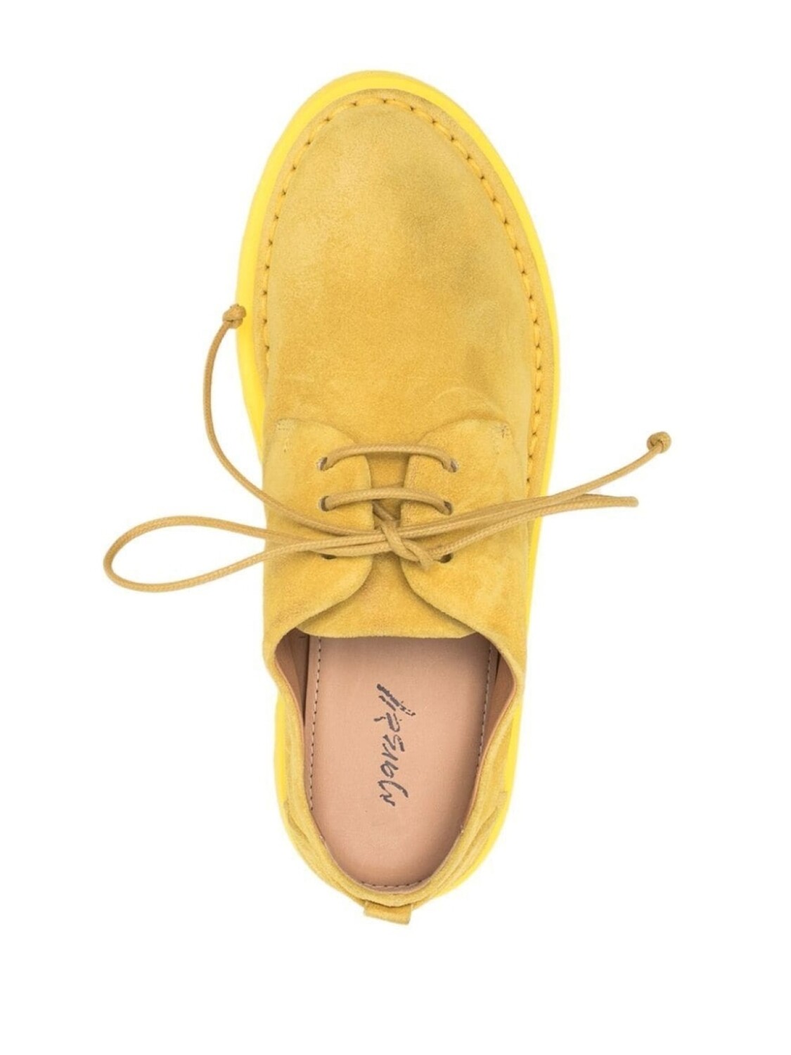 Ярко-желтый, кожа, замша, кожаная подкладка, миндалевидный носок, шнуровка спереди, стелька с логотипом и плоская резиновая подошва.