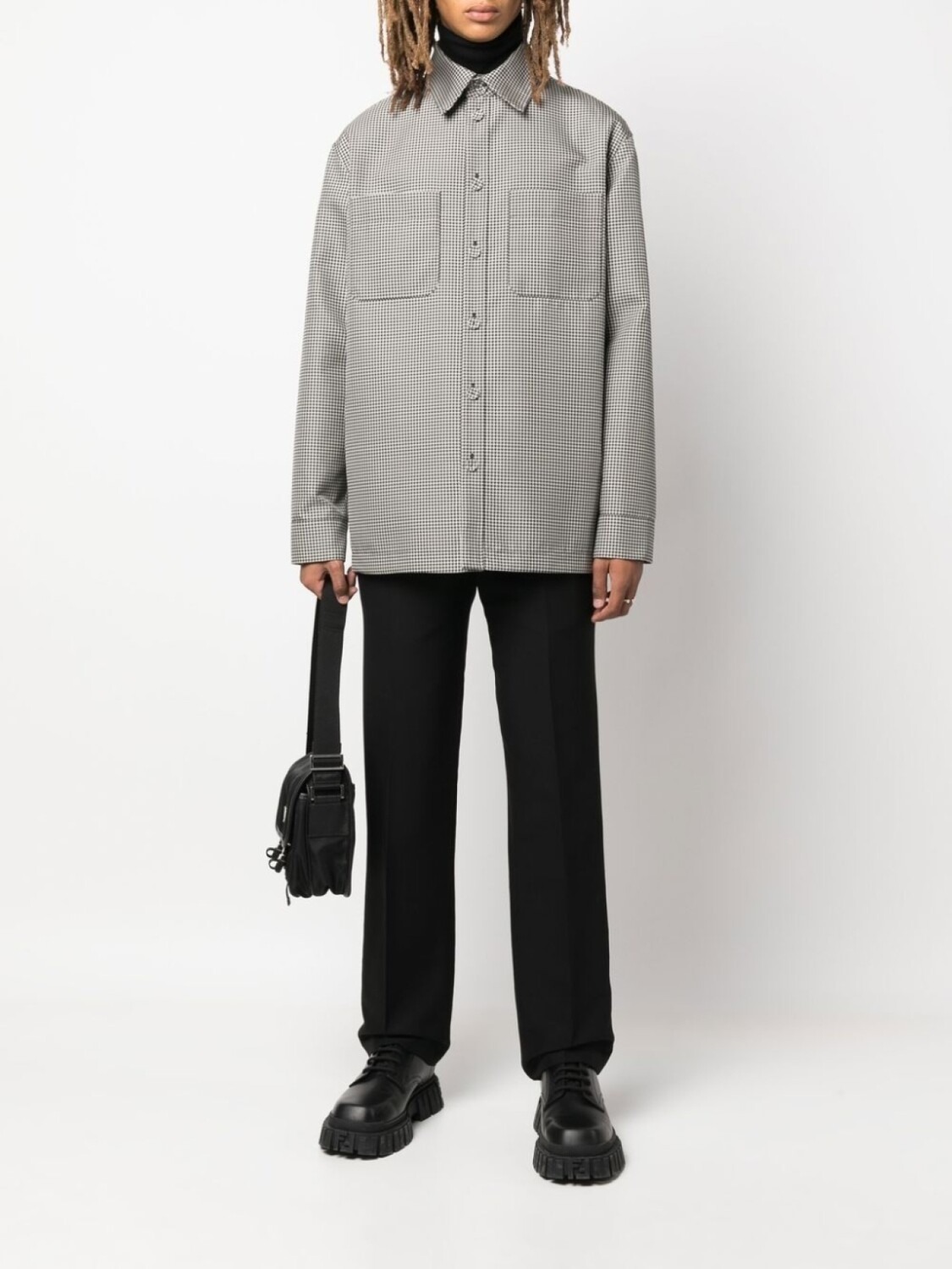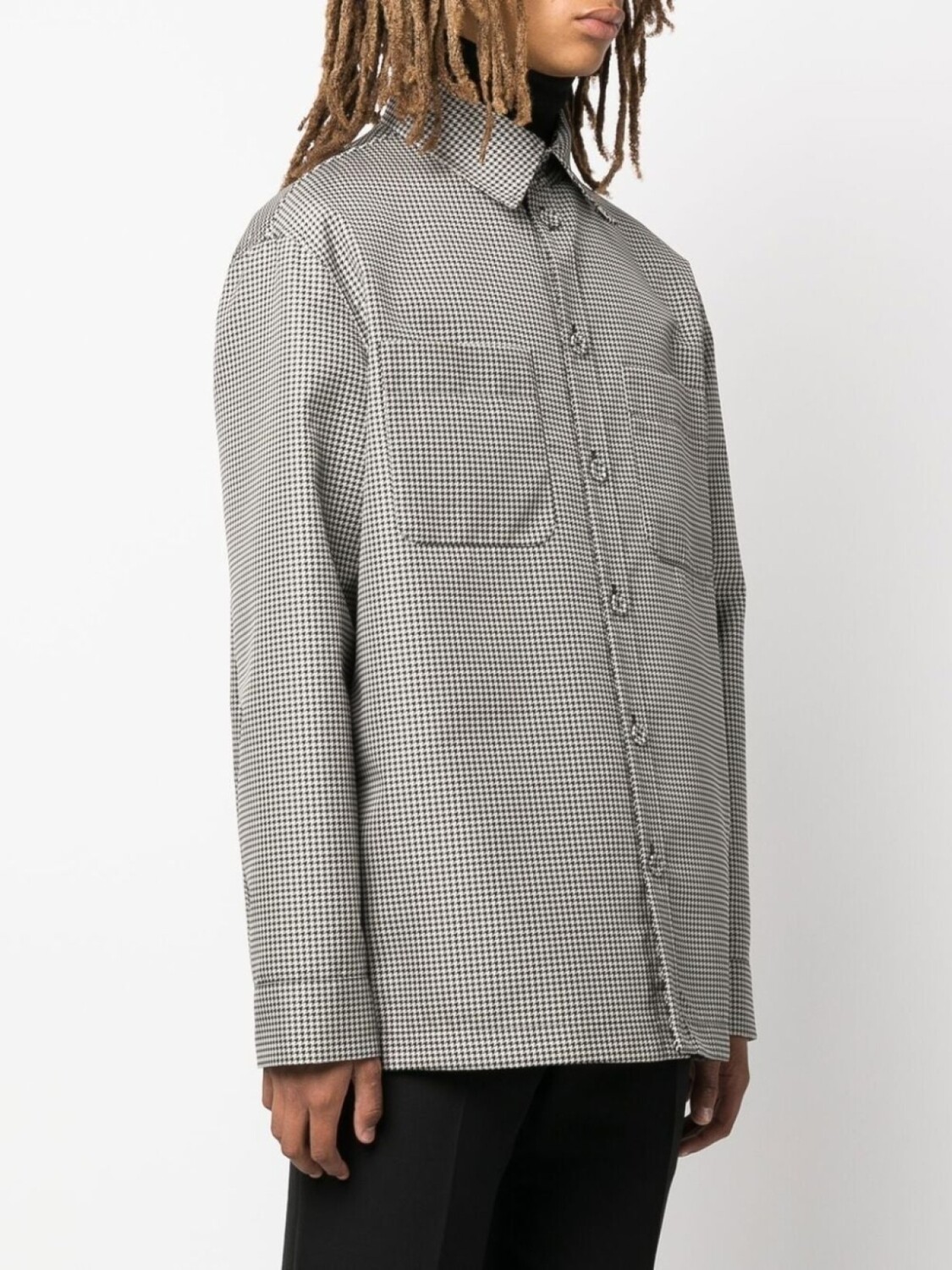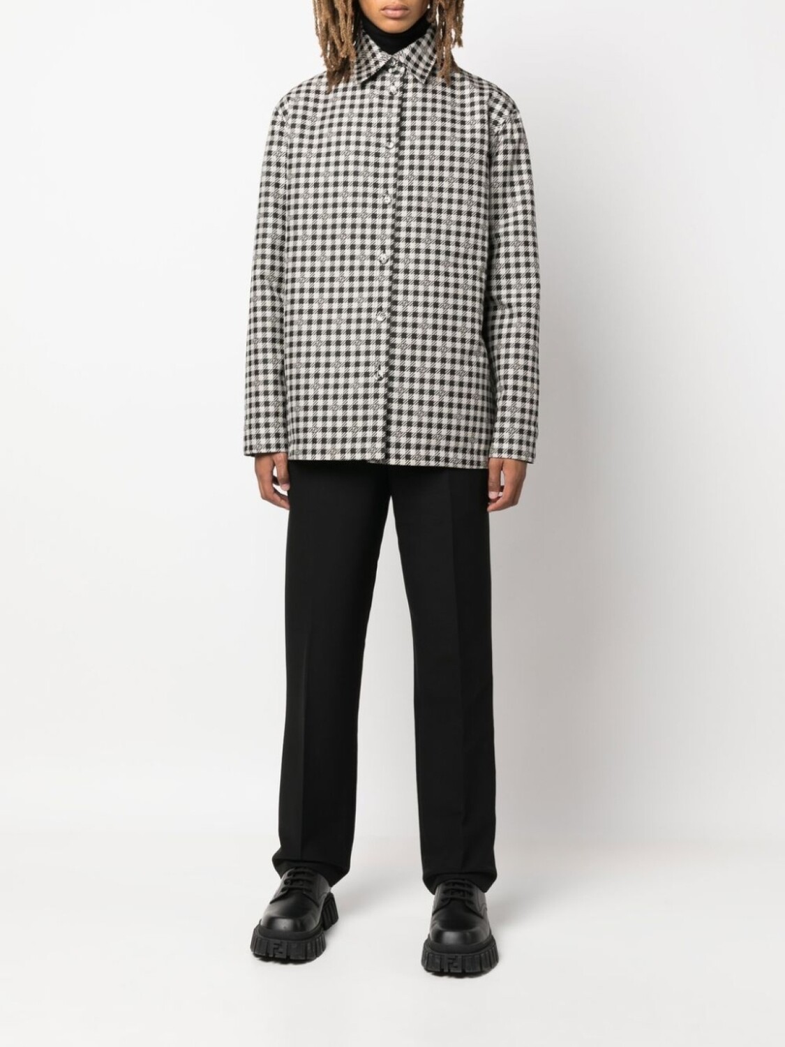 Черный/белый, узор в ломаную клетку, классический воротник, застежка на пуговицах спереди, длинные рукава, прямой подол, два нагрудных кармана с клапанами и двусторонний дизайн.