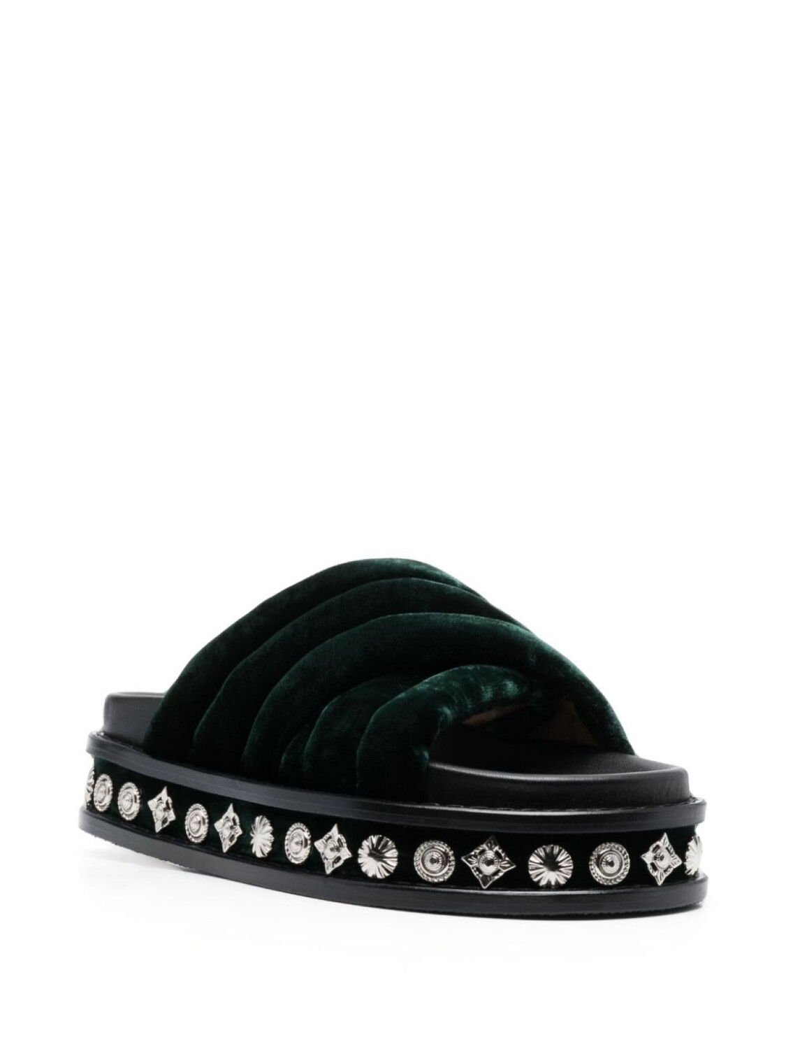 Темно-зеленый, бархат, заклепки, перекрестные ремешки, закругленный открытый носок, модель без застежки, кожаная стелька с логотипом и плоская платформа.