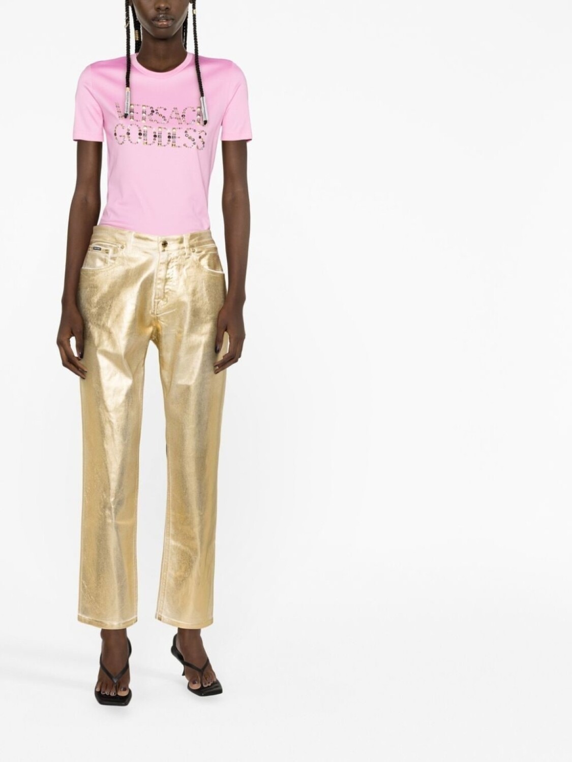 Розовый, хлопок, заклепки, декор из кристаллов, круглый вырез, короткие рукава и прямой подол.