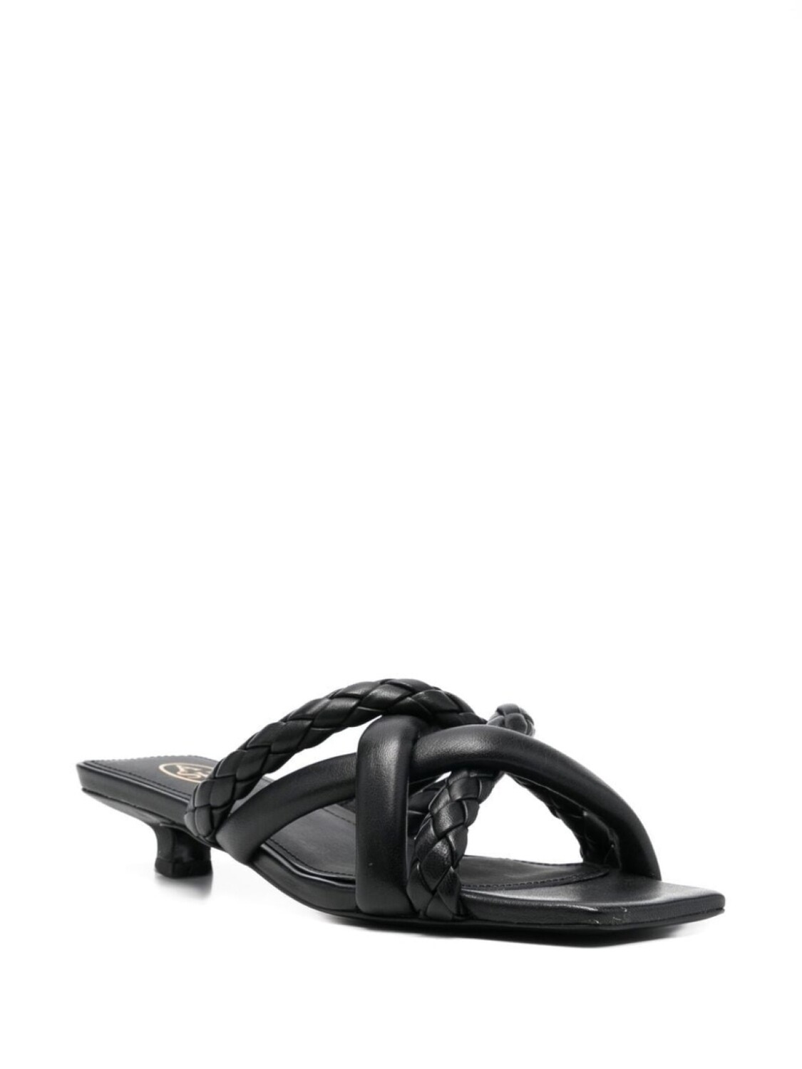 Черный, кожа, модель без застежки, без задника, плетеный ремень, открытый носок, квадратный носок, стелька с логотипом и каблук-рюмка.