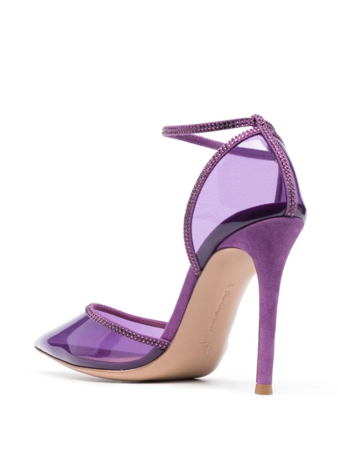 Темно-фиолетовый, телячья кожа, декор из кристаллов, полупрозрачный дизайн, заостренный носок, ремешок на щиколотке с пряжкой и каблук на высокой шпильке.