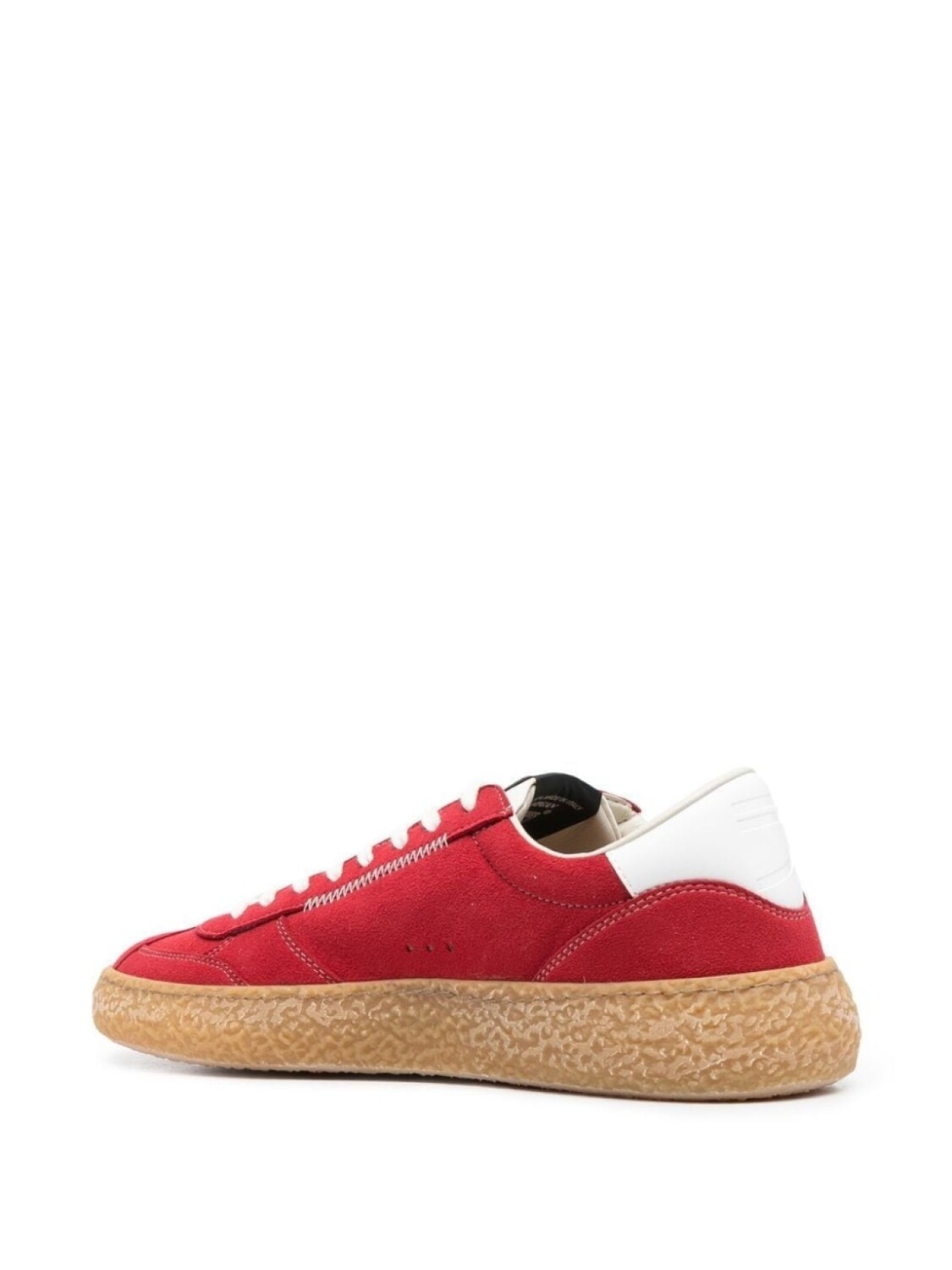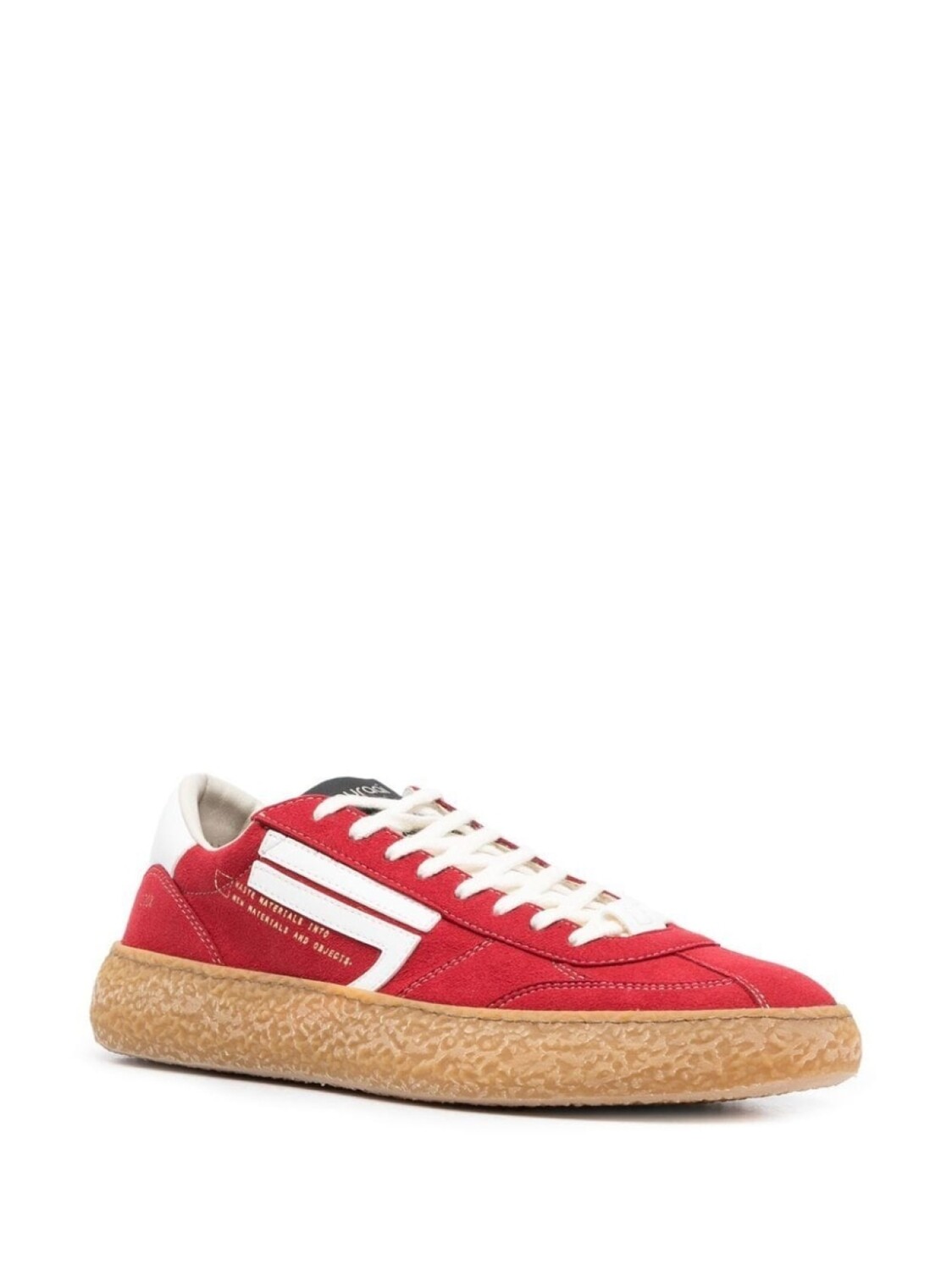 Красный, нашивка с логотипом сбоку, принт с надписью сбоку, контрастный задник с логотипом, шнуровка спереди и плоская резиновая подошва.