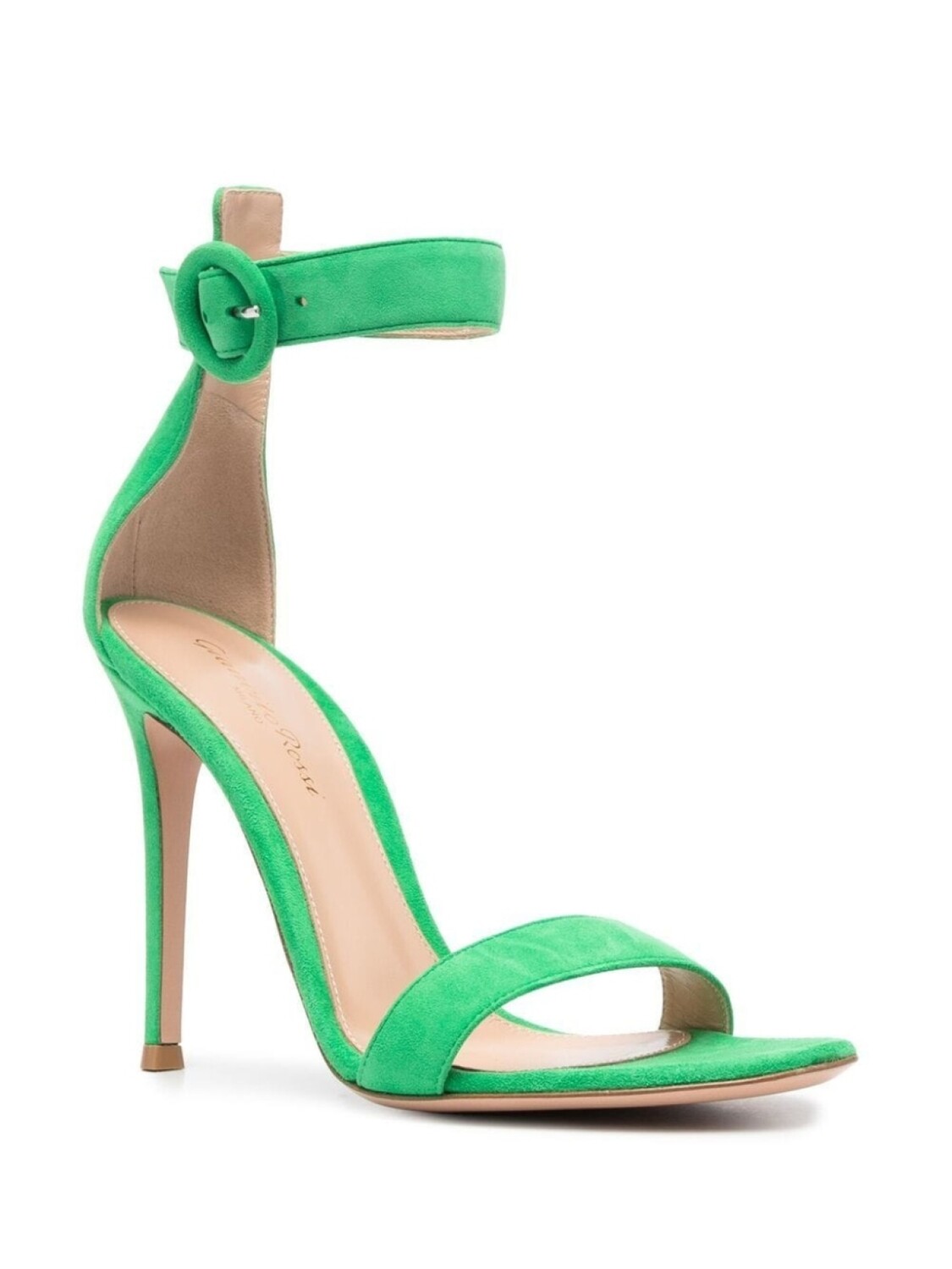 Ярко-зеленый, замша из телячьей кожи, кожаная стелька с логотипом, открытый носок, ремешок на щиколотке с пряжкой и каблук на высокой шпильке.