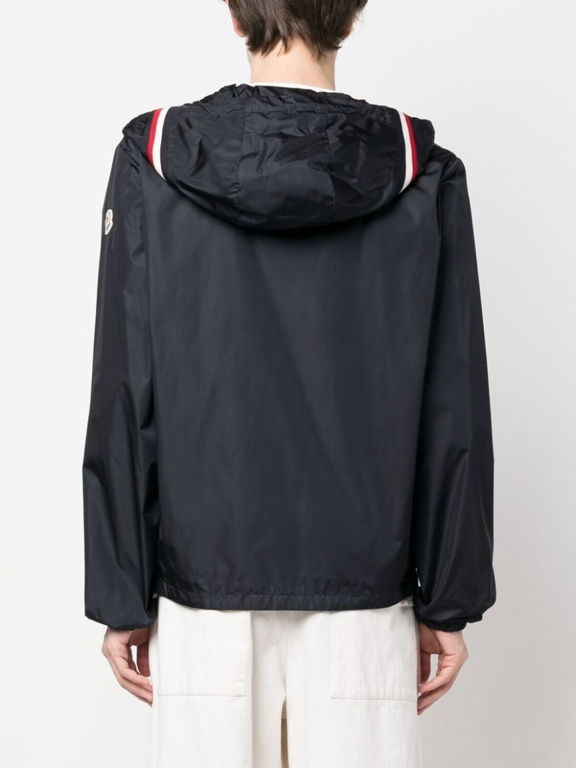 Темно-синий, нашивка с логотипом на рукаве, знаковый декор в виде триколора, легкий материал, водоотталкивающее покрытие, затягивающийся на шнурок капюшон, двусторонняя молния спереди, длинные рукава, эластичные манжеты, два боковых кармана с застежкой на кнопки и прямой подол.