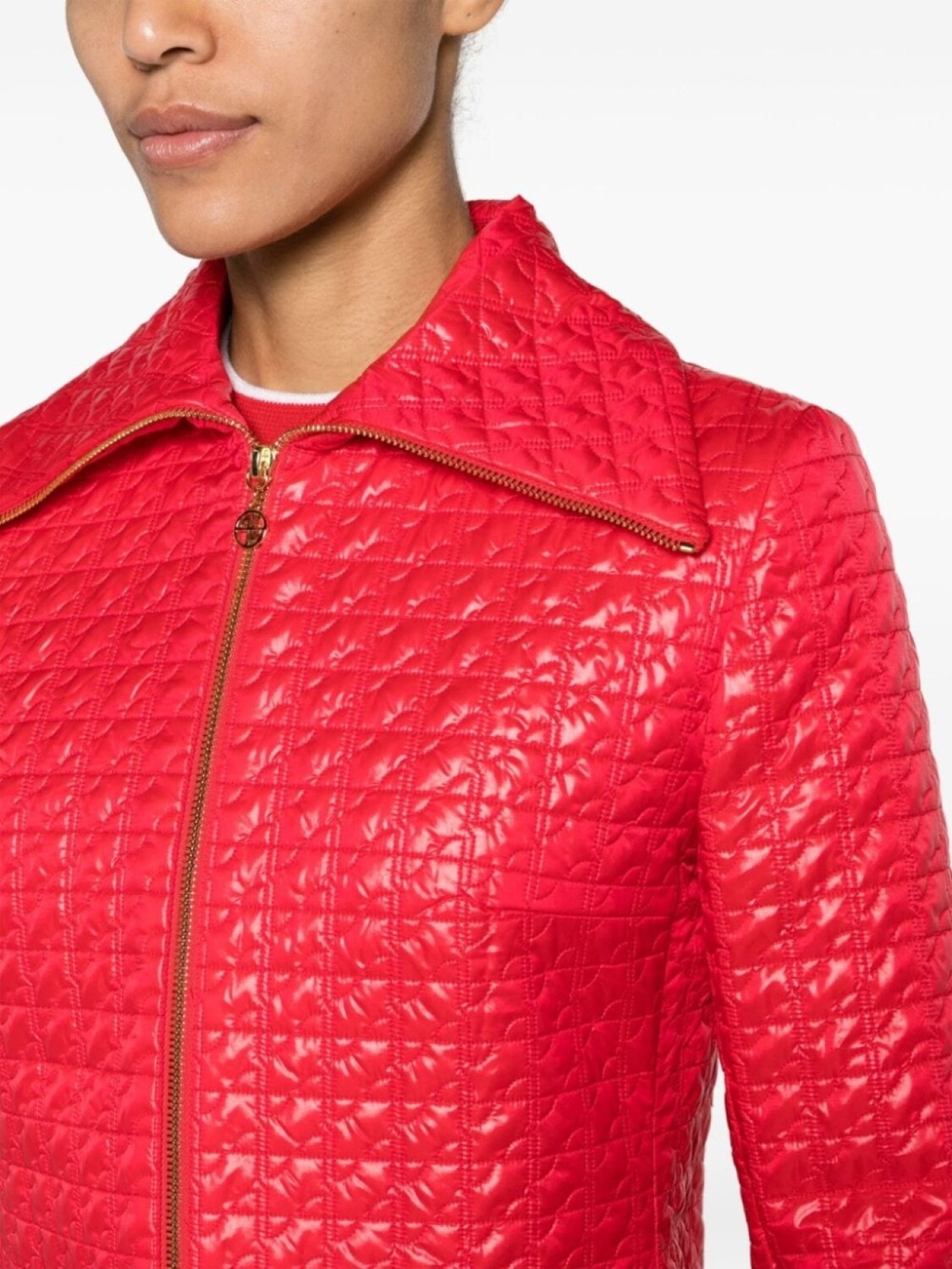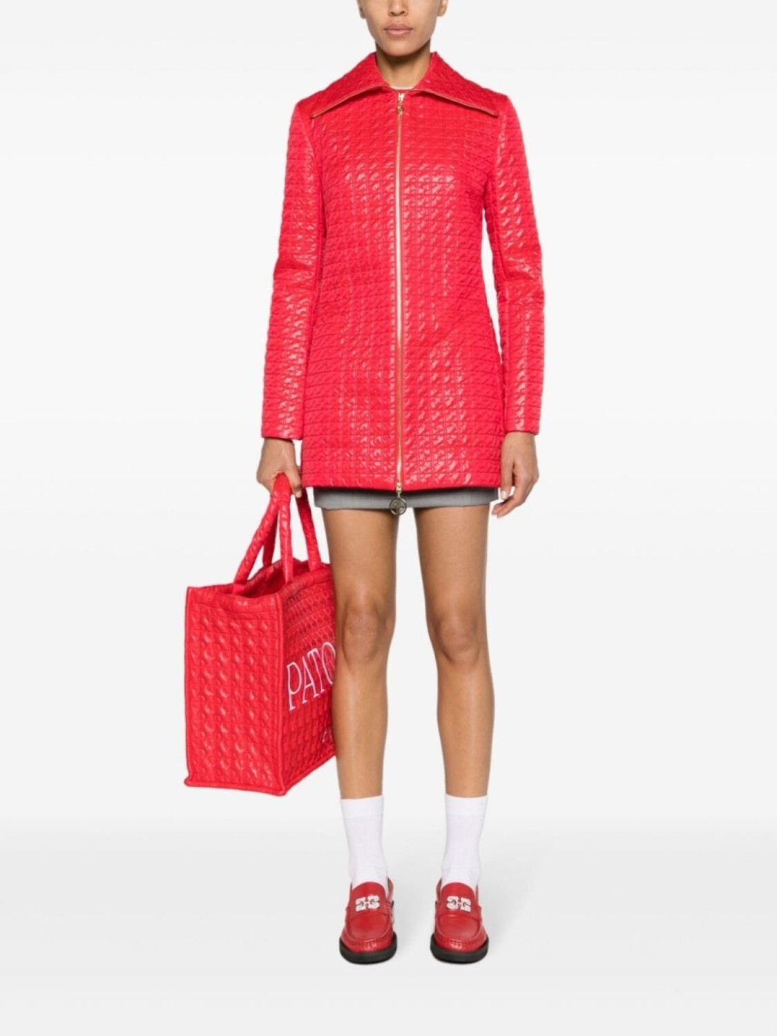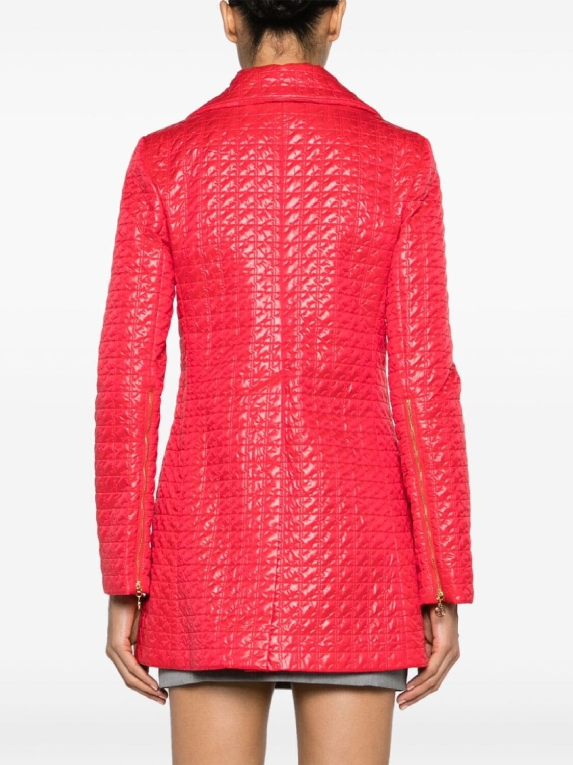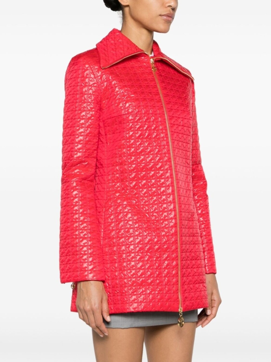 Ярко-красный, стеганая отделка, отложной воротник, двусторонняя молния спереди, длинные рукава, манжеты на молнии, два кармана на молнии по бокам, шлица по центру сзади, прямой подол и модель без подкладки.