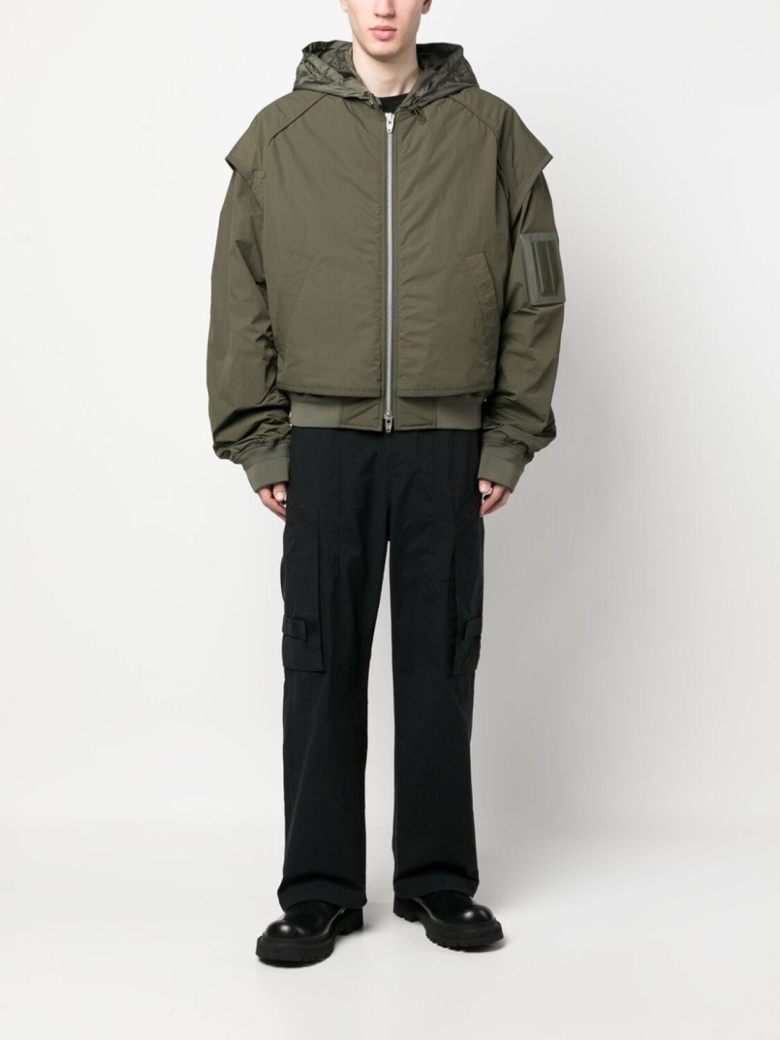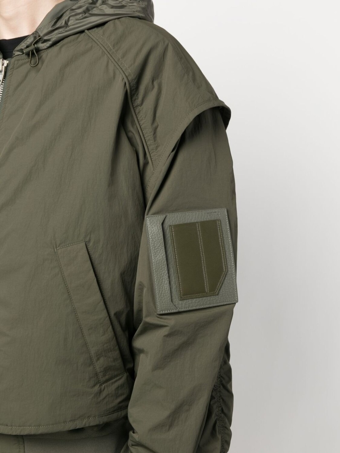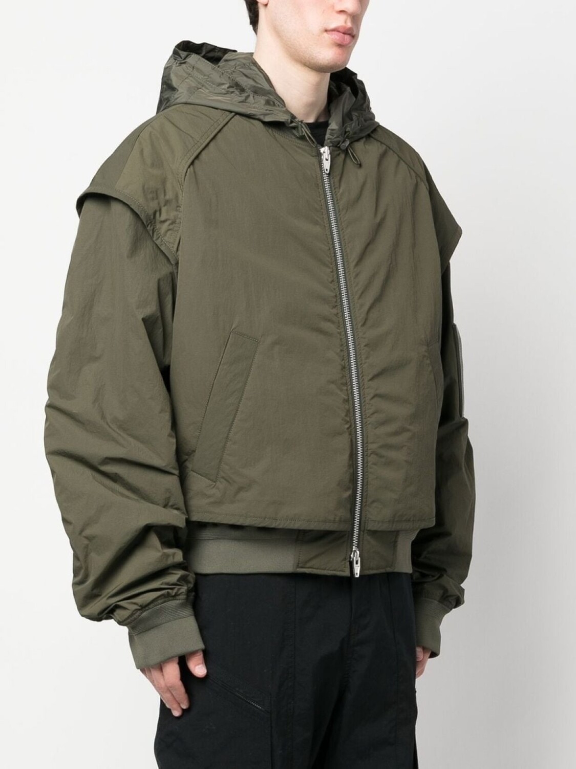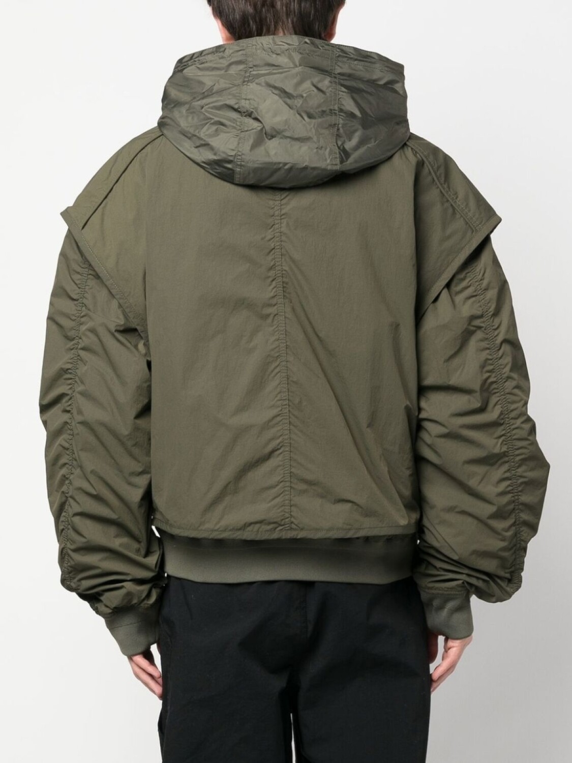 Хаки, детали с оборками, классический капюшон, логотип-аппликация, нашивка, двусторонняя молния спереди, два прорезных кармана сбоку, воротник-стойка в рубчик и прямой подол.