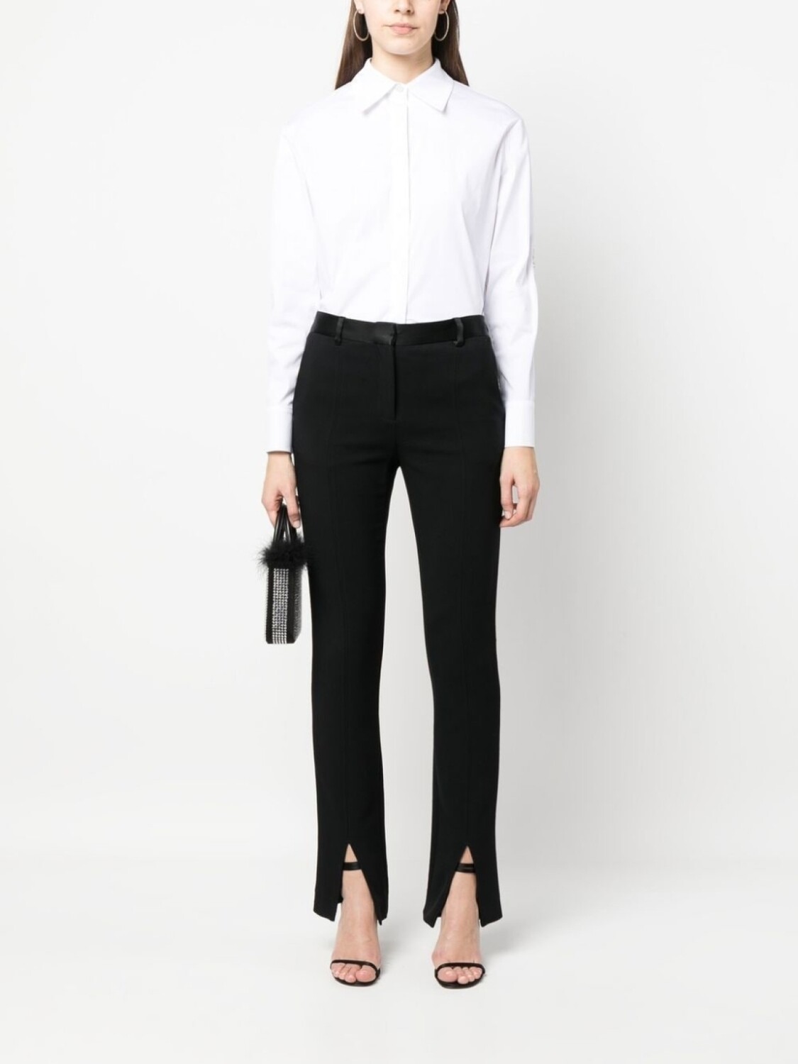 Кремовый, эластичный хлопок, воротник-стойка, застежка на пуговицах спереди, длинные рукава, манжеты на пуговицах и закругленный подол.