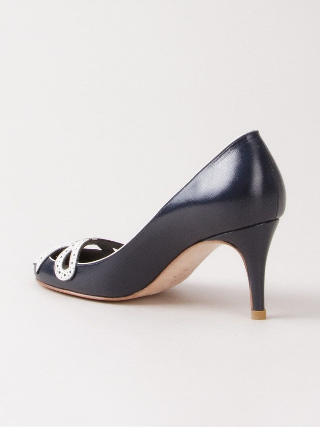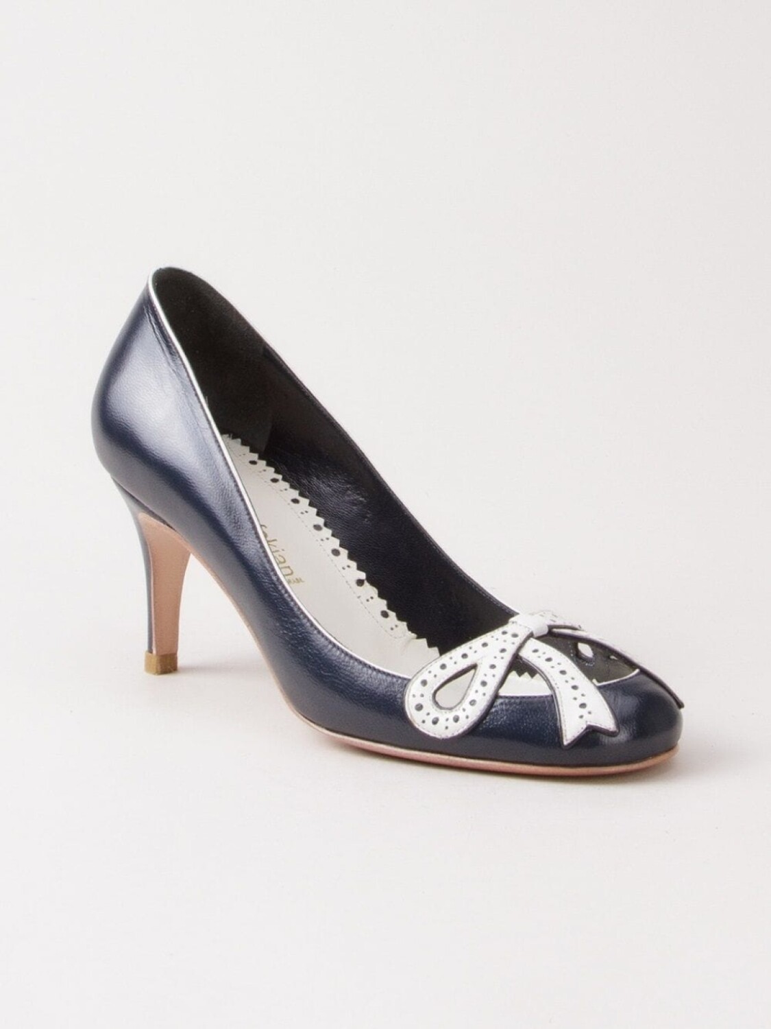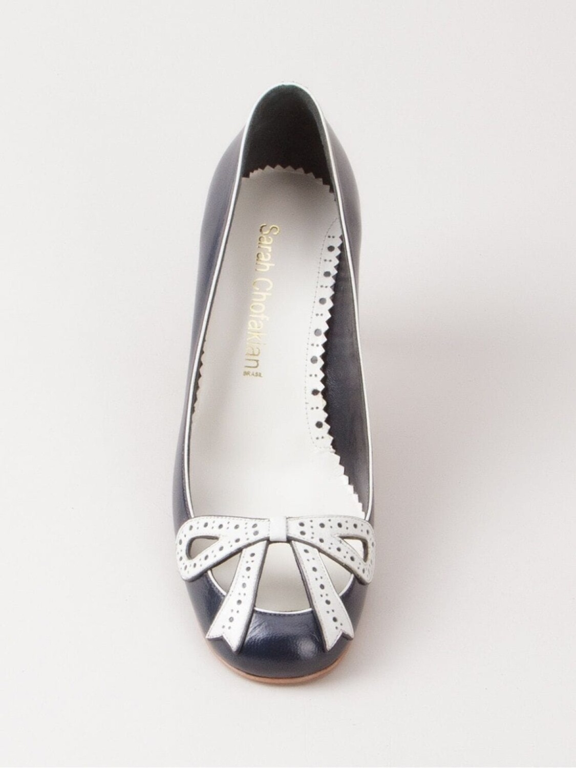 Туфли на каблуке от Sarah Chofakian. Фирменная стелька, контрастная окантовка, бант спереди, шпилька средней высоты и закругленный носок.