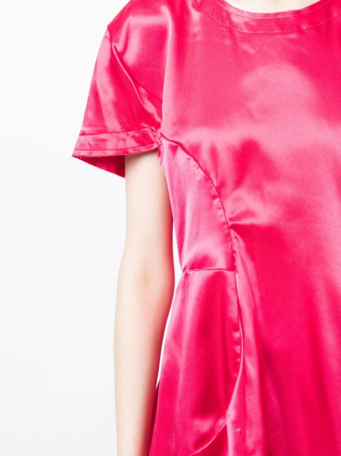 Фуксия, вставки, круглый вырез, короткие рукава и закругленный подол.