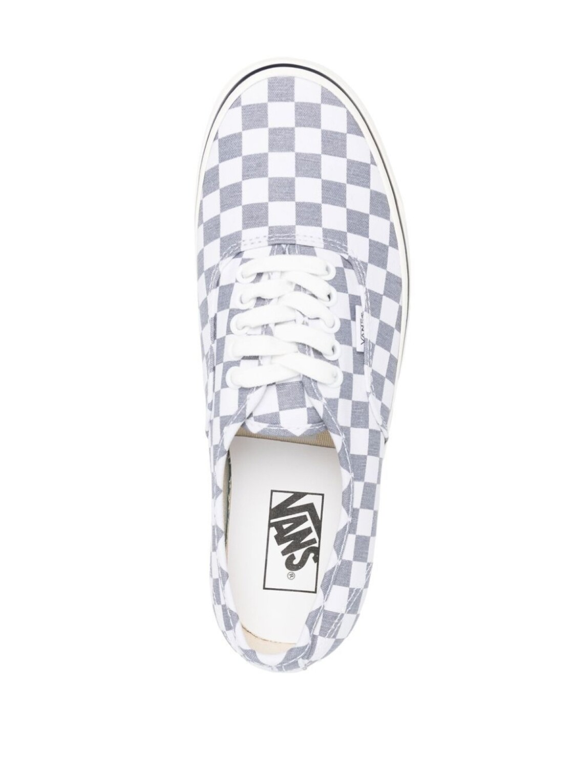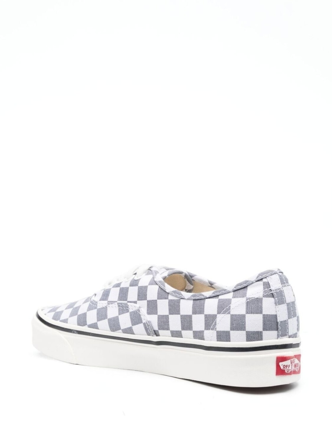 Белый, серый, принт в шахматную клетку, маленькая подвеска с логотипом, нашивка с логотипом сзади, стелька с логотипом, закругленный носок, шнуровка спереди и плоская резиновая подошва.