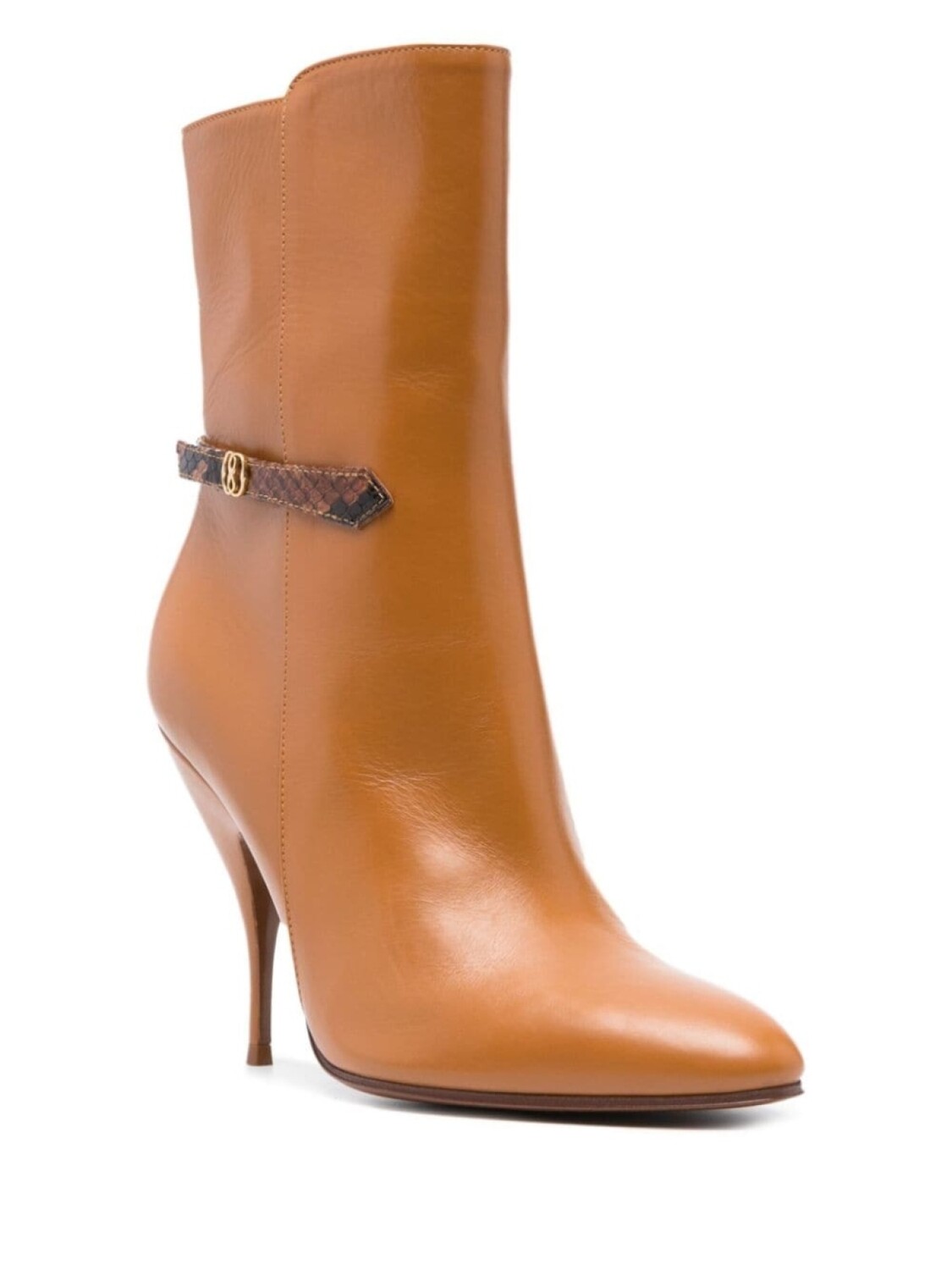 Коричневый, телячья кожа, застежка на молнии сбоку, пряжка с логотипом, заостренный носок, стелька с логотипом и высокий каблук.