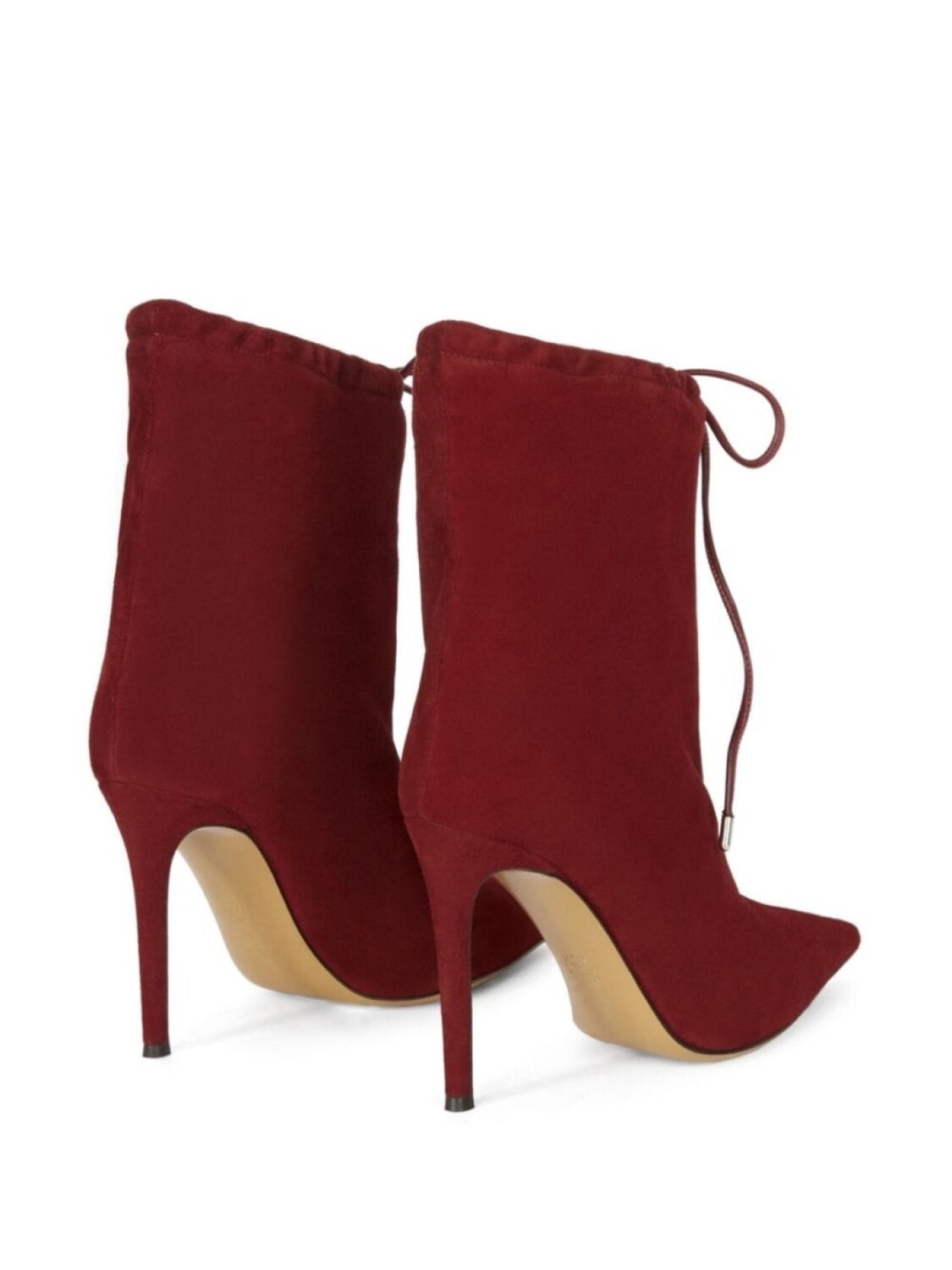 Бордовый, телячья кожа, замша, заостренный носок, завязки спереди, кожаная стелька с логотипом, каблук на высокой шпильке и кожаная подошва.