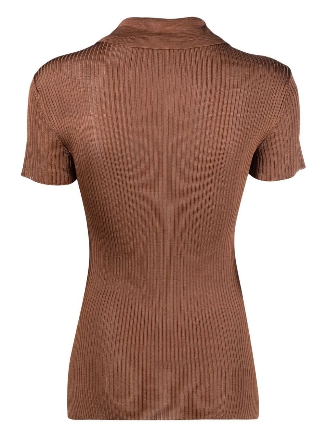 Шоколадный, детали в рубчик, воротник поло, планка на пуговицах спереди, короткие рукава и прямой подол. Ответственный выбор: В состав этого товара входят материалы, сертифицированные организациями Forest Stewardship Council (FSC) или Programme for the Endorsement of Forest Certification (PEFC).