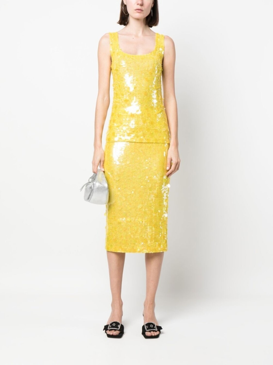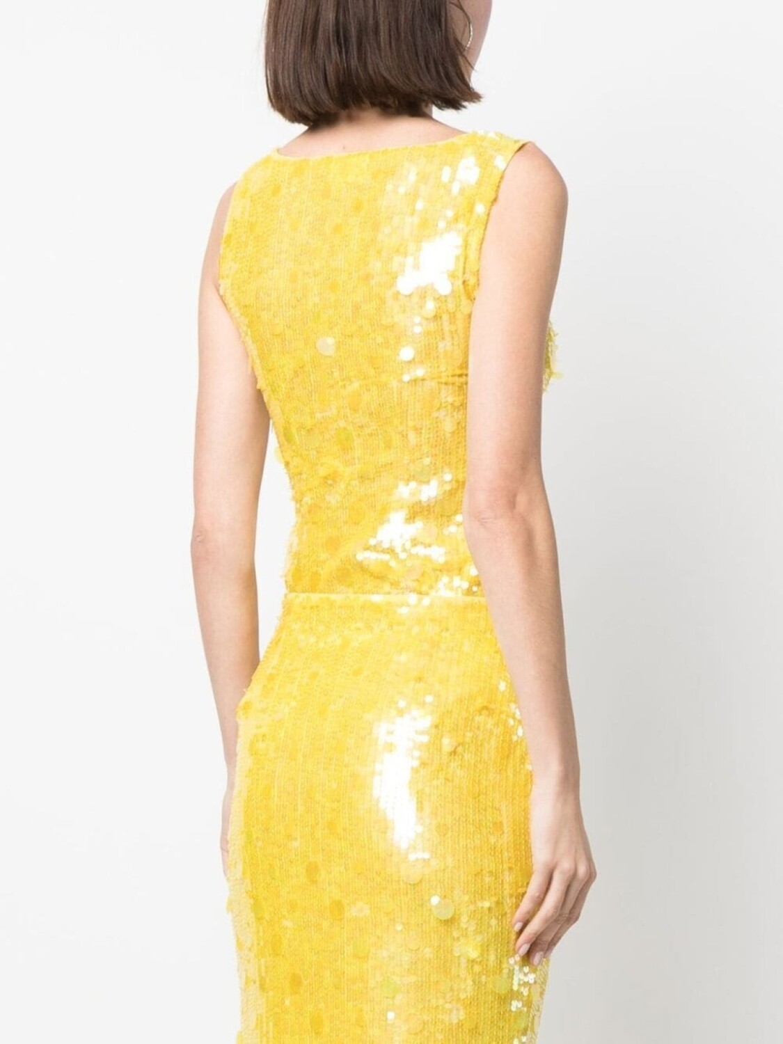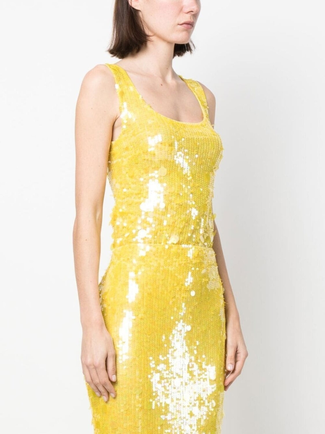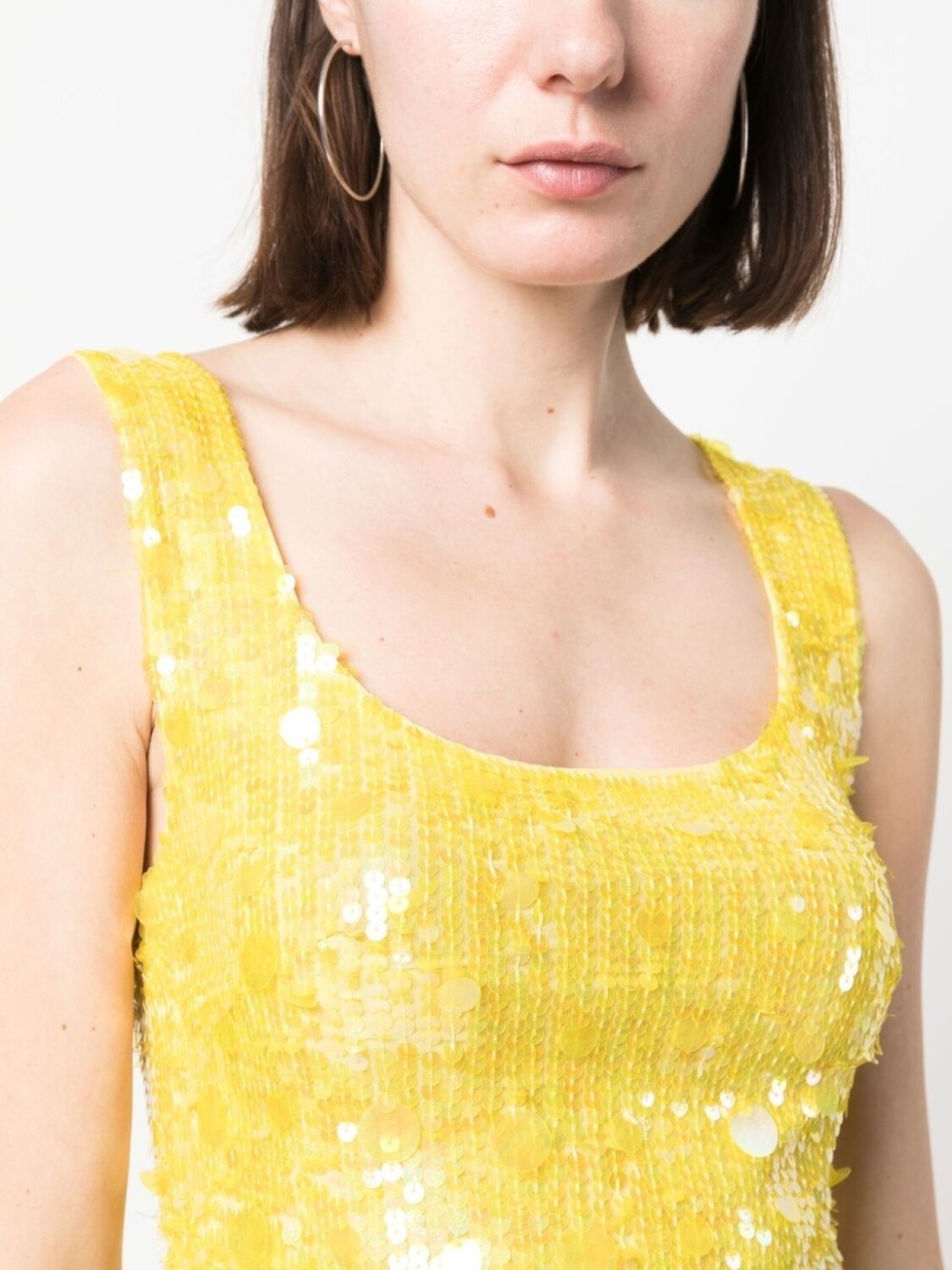 Канареечный, украшение из пайеток, U-образный вырез, без рукавов и закругленный подол.