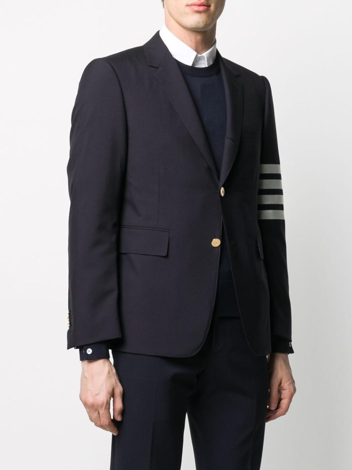 Пиджак с полосками 4-Bar от THOM BROWNE. Зазубренные лацканы, застежка на пуговицах спереди, застежка на пуговицах спереди, золотистая фурнитура, нагрудный карман, передние карманы с клапанами, длинные рукава, манжеты на пуговицах и фирменная трехцветная полоска.