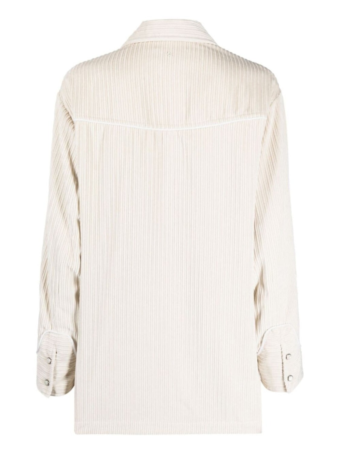 Кремово-белый, вельветовый материал, отложной воротник, застежка на кнопках спереди, приспущенные плечи, длинные рукава, манжеты с застежкой на кнопки и прямой подол.