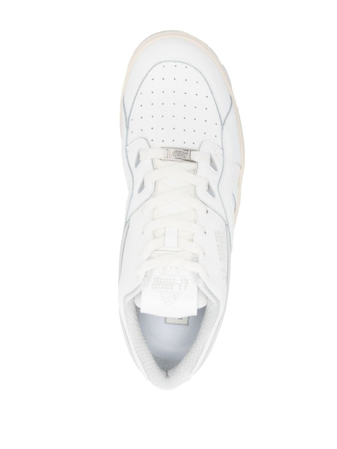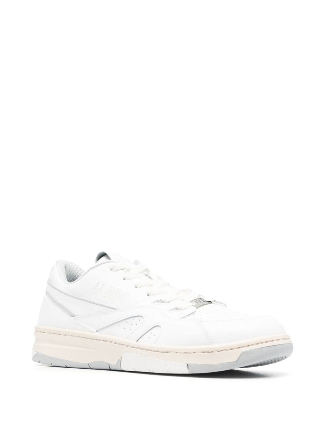 Белый, телячья кожа, вставки, серебристый металлический логотип, плоская резиновая подошва, шнуровка спереди и закругленный носок.