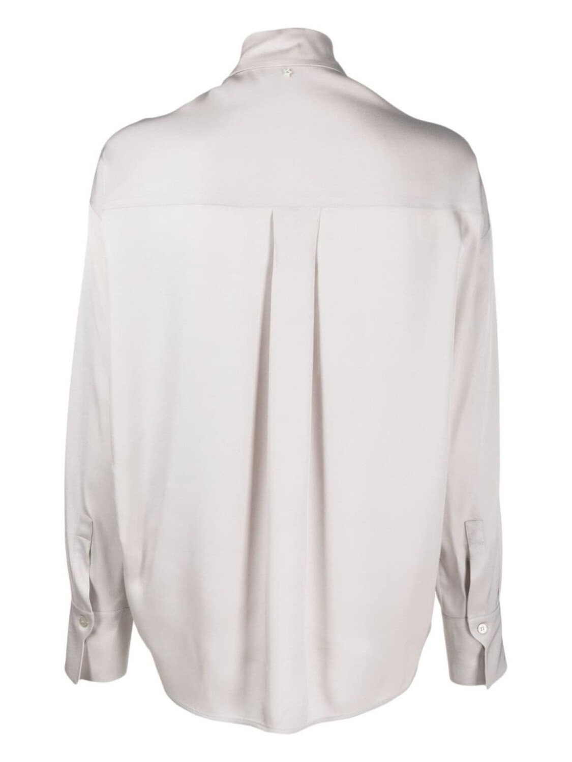 Светло-серый, отложной воротник, застежка на пуговицах спереди, длинные рукава, манжеты на пуговицах и закругленный подол.