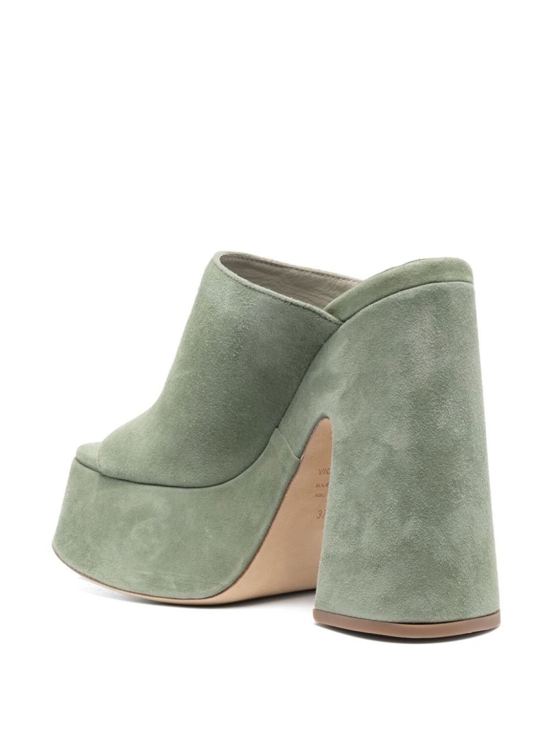 Светло-зеленый, замша из телячьей кожи, открытый носок, стелька с логотипом, высокий блочный каблук и модель без застежки.
