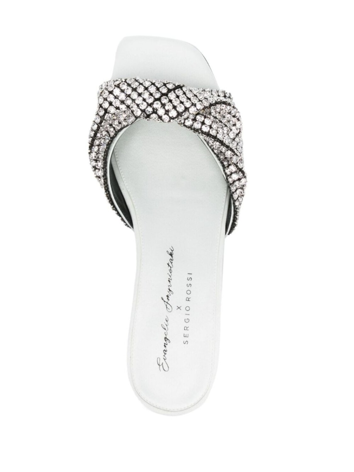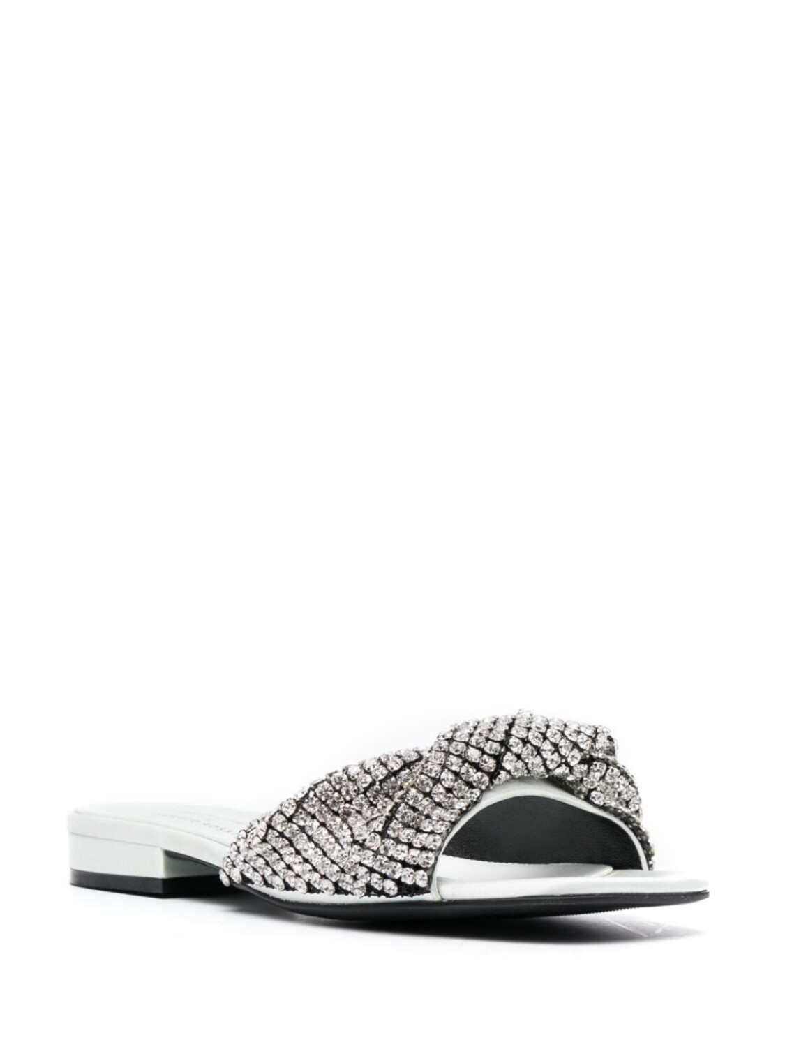 Серебристый, телячья кожа, сатиновая фактура, декор из кристаллов, кожаная стелька с логотипом, открытый носок, квадратный носок, модель без застежки и плоская резиновая подошва.