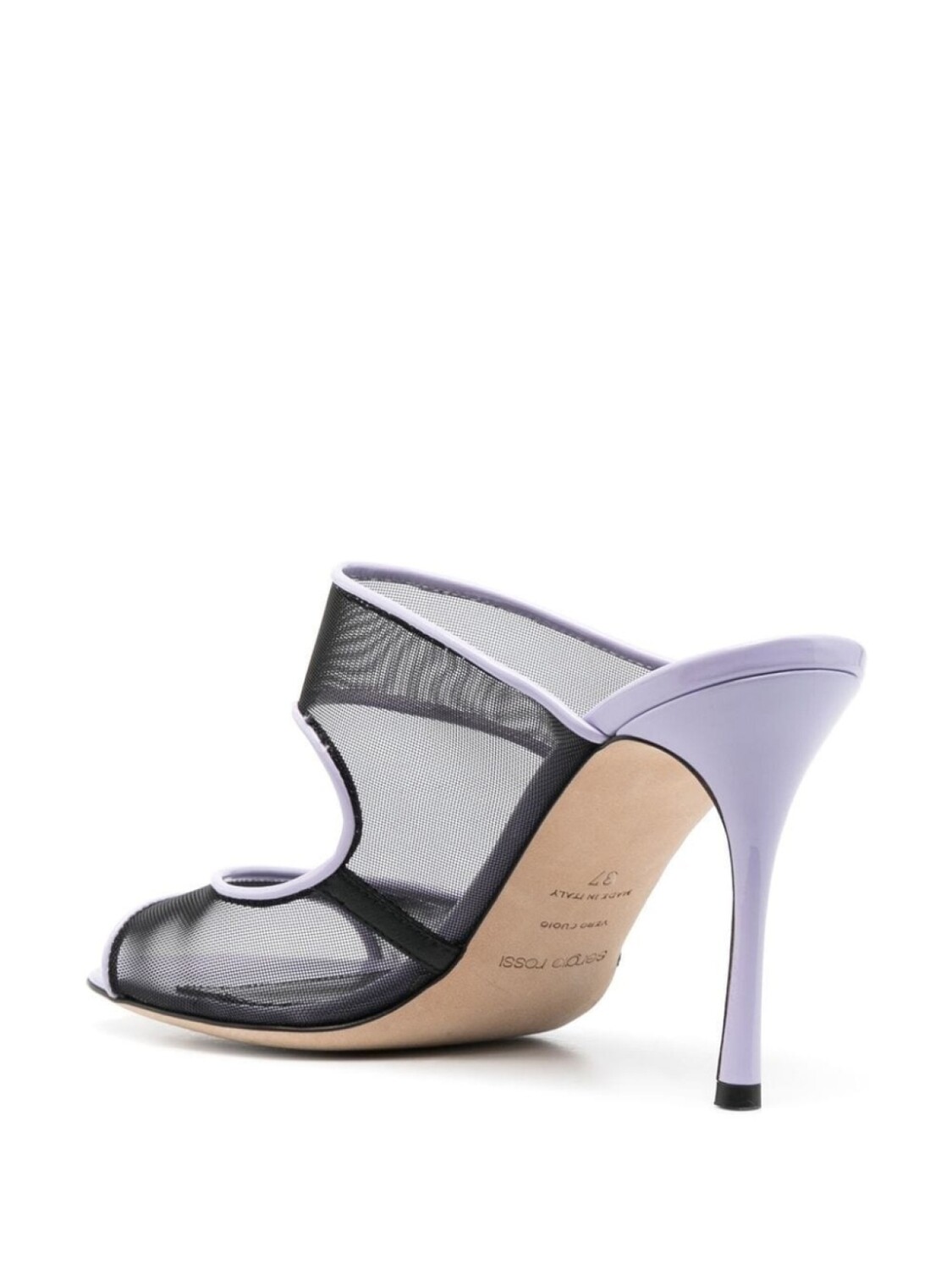Черный, фиолетовый, телячья кожа, сетка, прозрачные вставки, открытый носок, стелька с логотипом и высокий каблук.