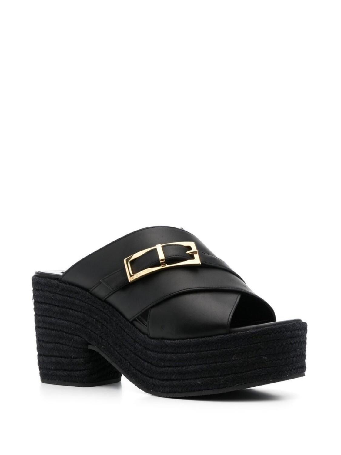 Черный, телячья кожа, выгравированный логотип, застежка на золотистой пряжке, перекрестные ремешки, открытый носок, подошва на платформе и блочный каблук средней высоты.