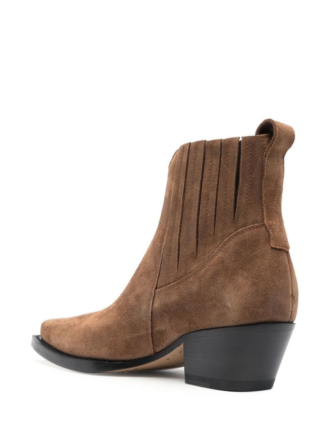 Коричневый, телячья кожа, низкий блочный каблук, эластичные боковые вставки и квадратный носок.