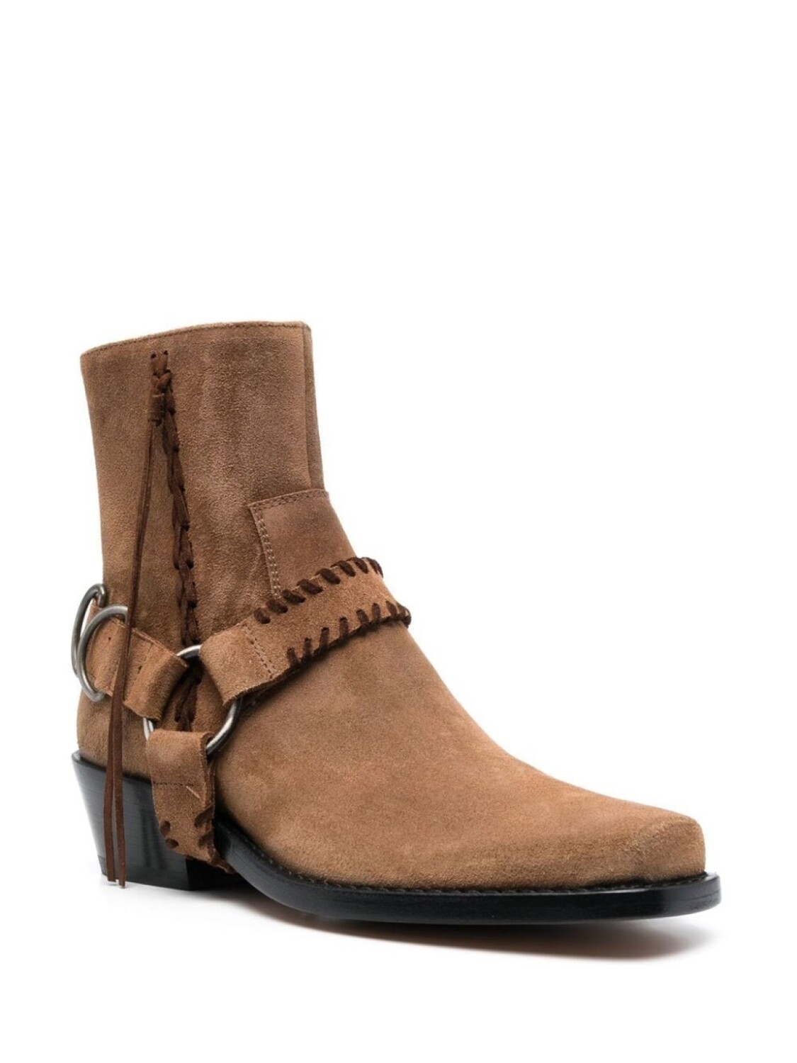 Коричневый, замша из телячьей кожи, ремешки, декоративная строчка, серебристая фурнитура, высота по щиколотку, застежка на молнии сбоку и низкий блочный каблук.