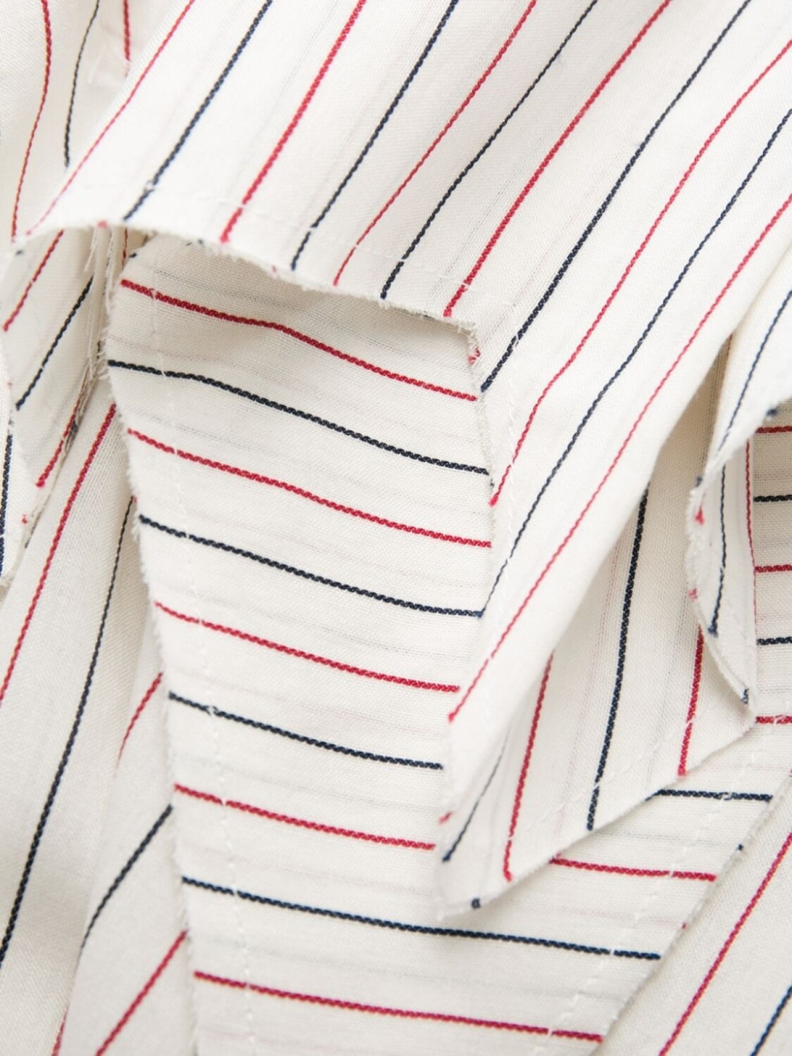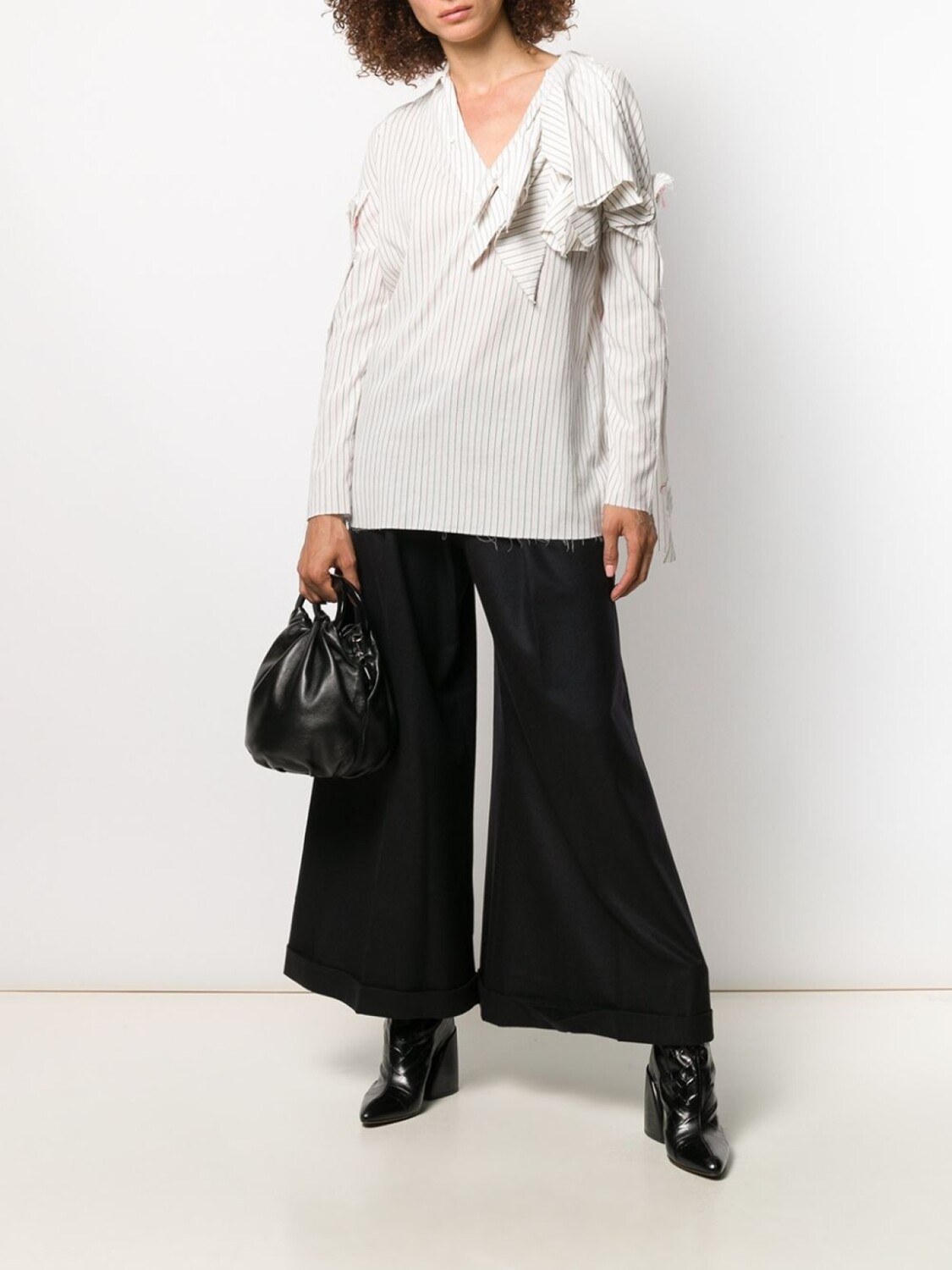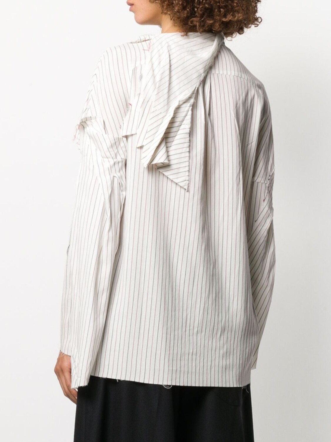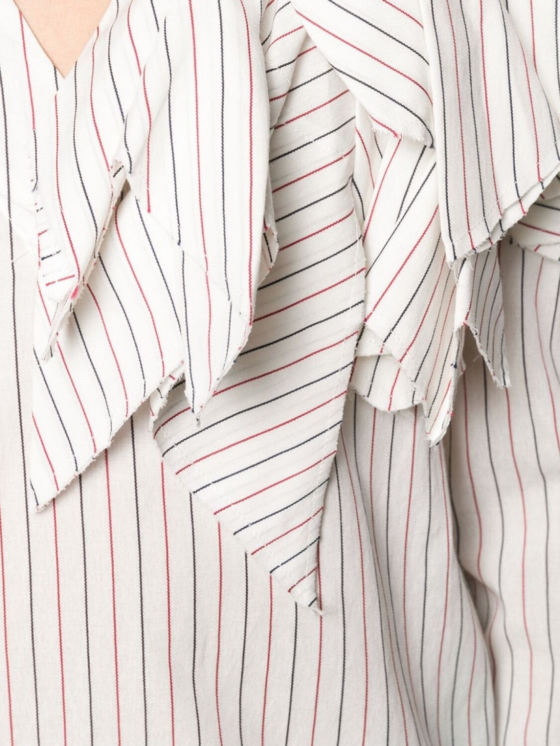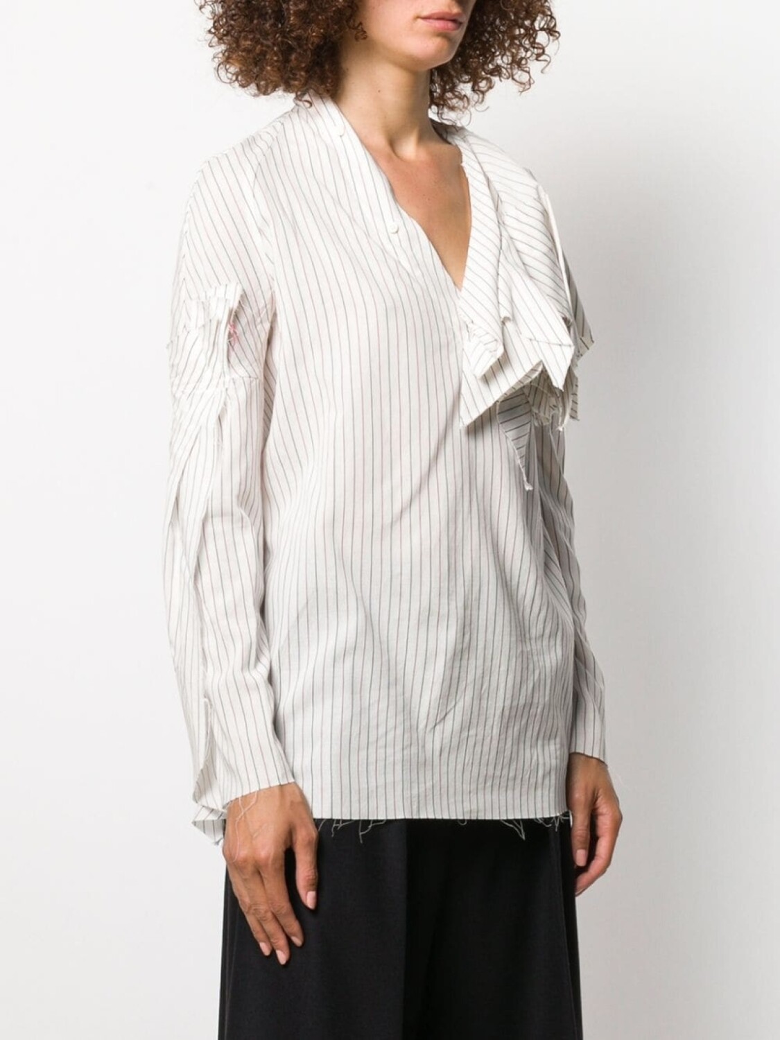 Полосатая рубашка с необработанными краями от Aganovich. V-образная горловина, длинные рукава, необработанные края, прямой подол и вертикальные полоски.