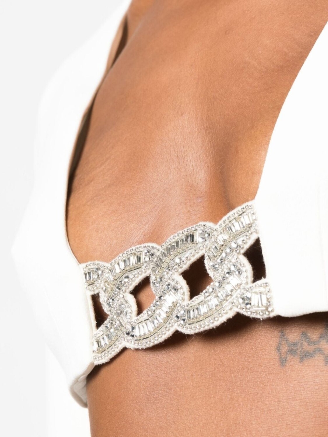 Белый, декор из стеклянных кристаллов, вырезные детали, глубокий U-образный вырез, квадратный вырез, застежка на молнии сзади, длинные рукава, прямой подол и укороченная длина.