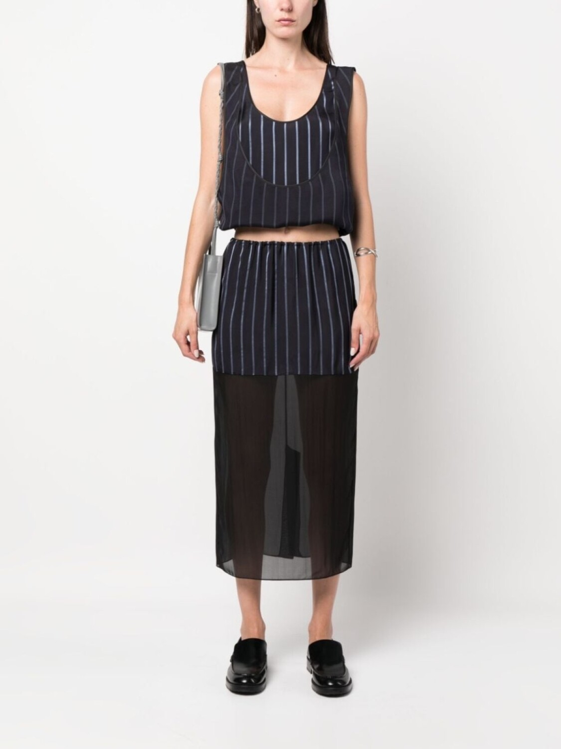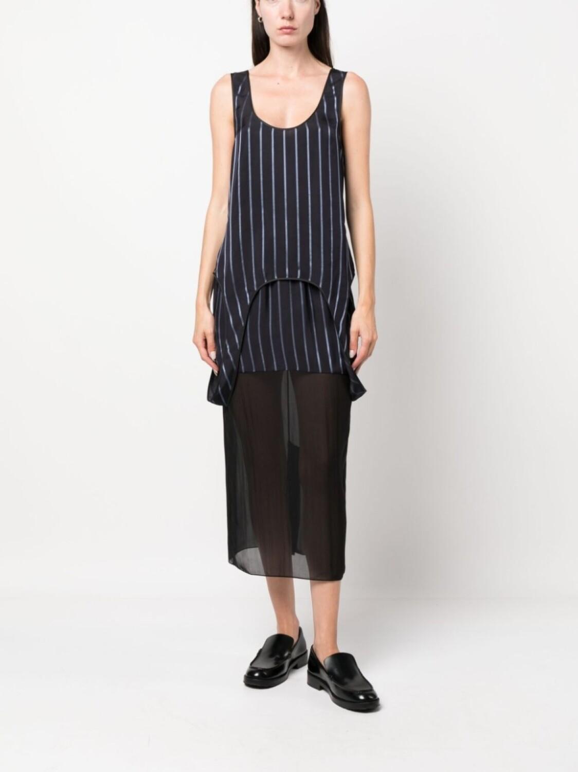 Темно-синий, многослойный дизайн, узор в вертикальную полоску, U-образный вырез, без рукавов и укороченная длина.