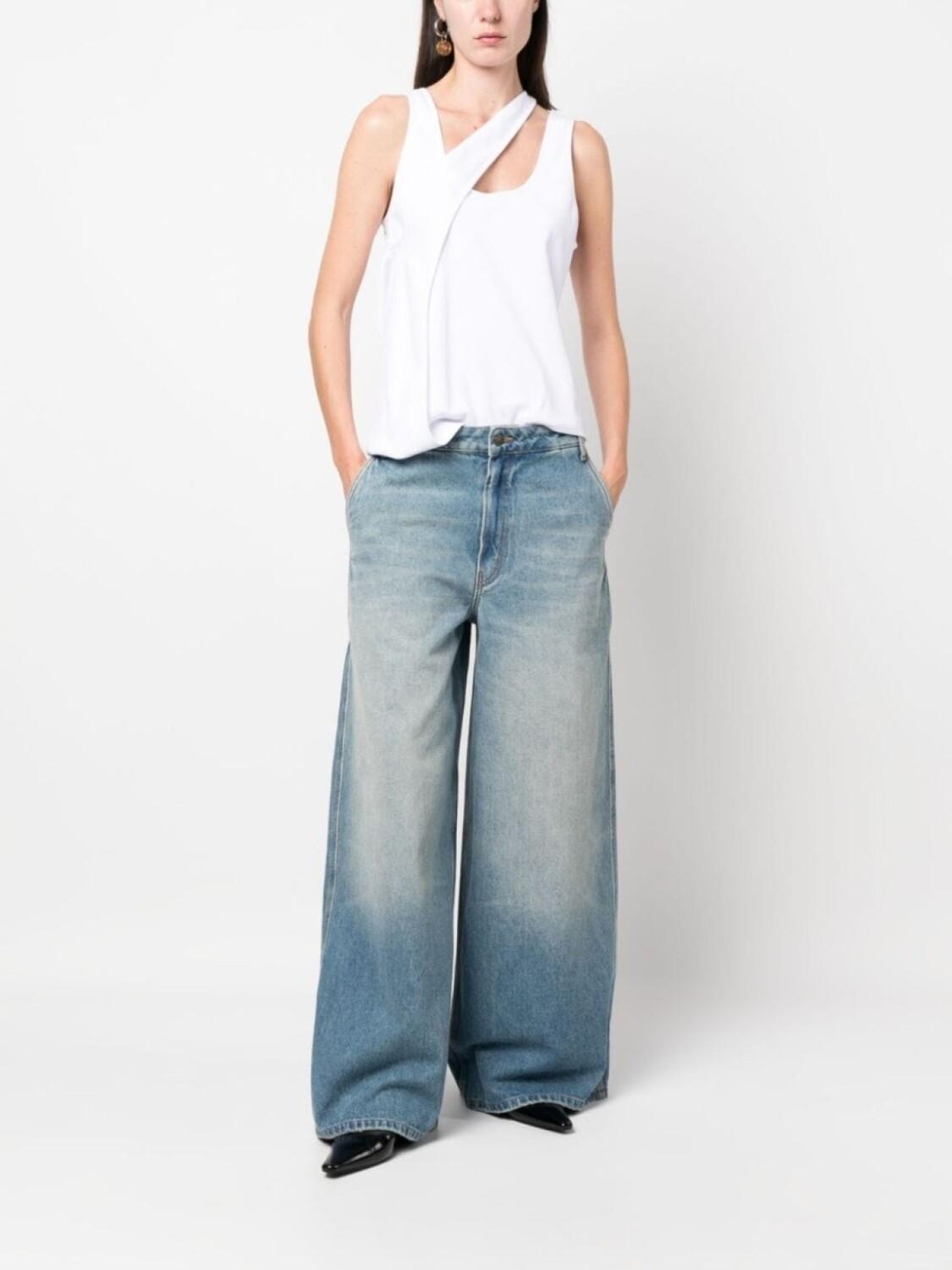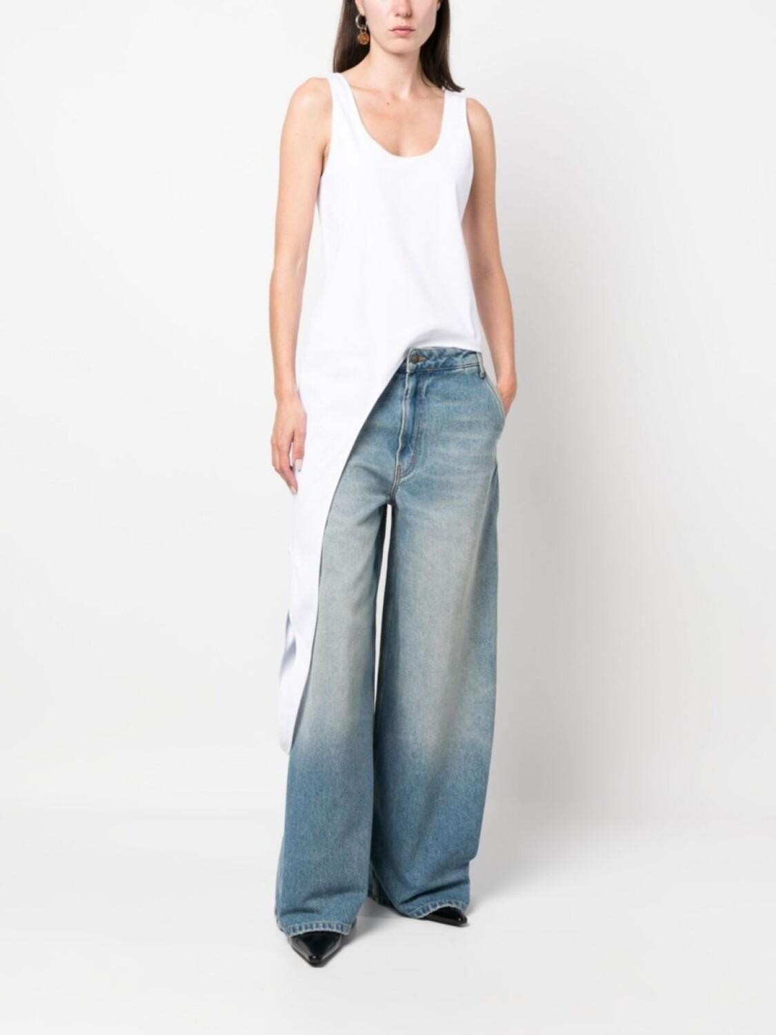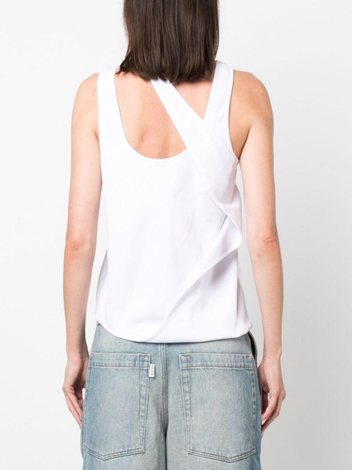 Белый, эластичный хлопок, трикотаж в рубчик, асимметричная форма, U-образный вырез, перекрестные ремешки и без рукавов.