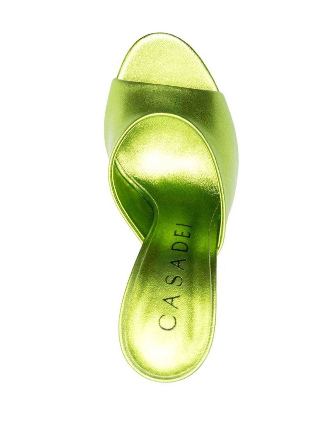 Шартрез, телячья кожа, покрытие с эффектом металлик, миндалевидный носок, открытый носок, стелька с логотипом, высокий каблук и модель без застежки.