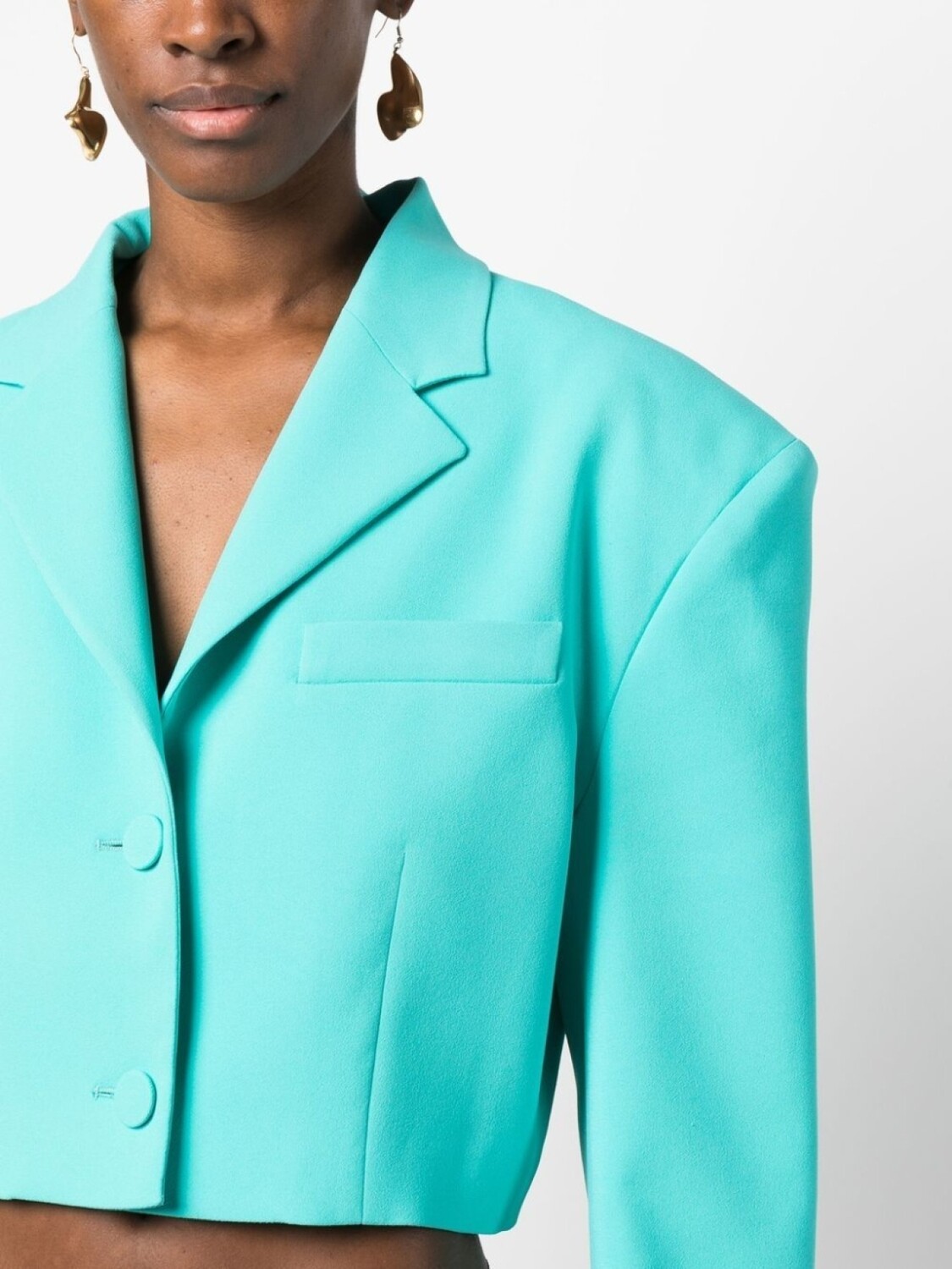 Прорезной карман на груди, застежка на пуговицах спереди, отложный воротник, подплечники, длинные рукава, укороченная длина и прямой подол.