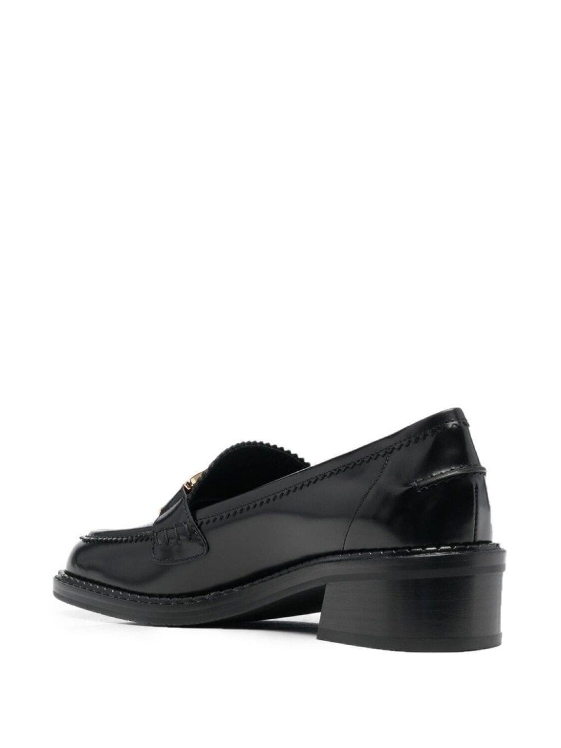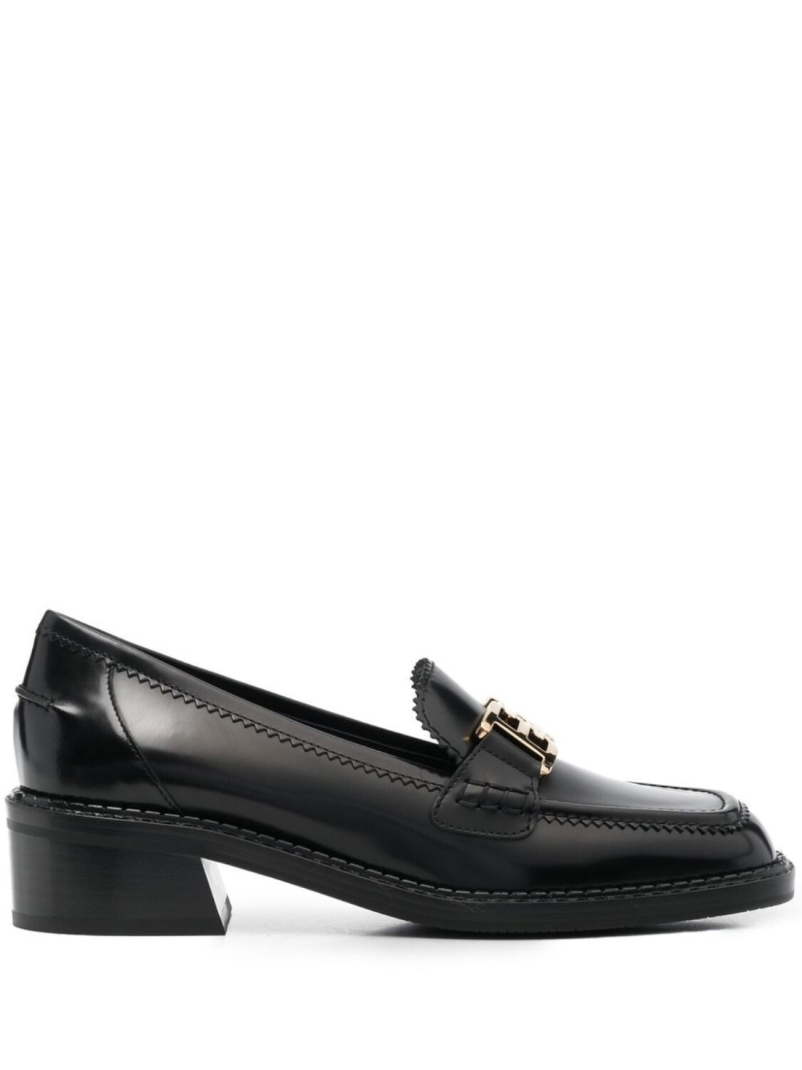 Черный, телячья кожа, знаковый декор Horsebit, золотистый металлический логотип, квадратный носок и низкий блочный каблук.