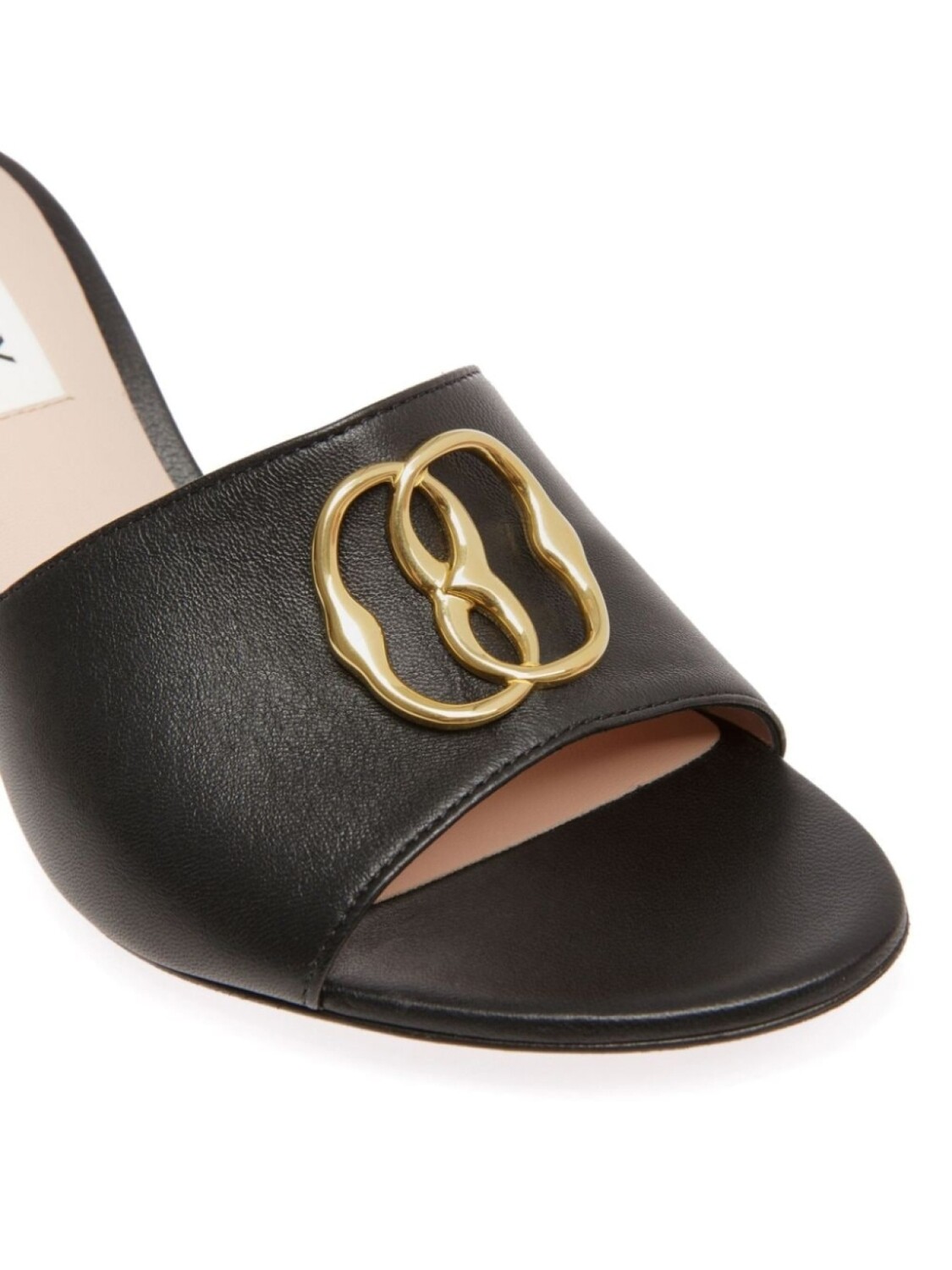 Черный, кожа, закругленный открытый носок, золотистый металлический логотип, высокий каблук, кожаная стелька с логотипом и модель без застежки.
