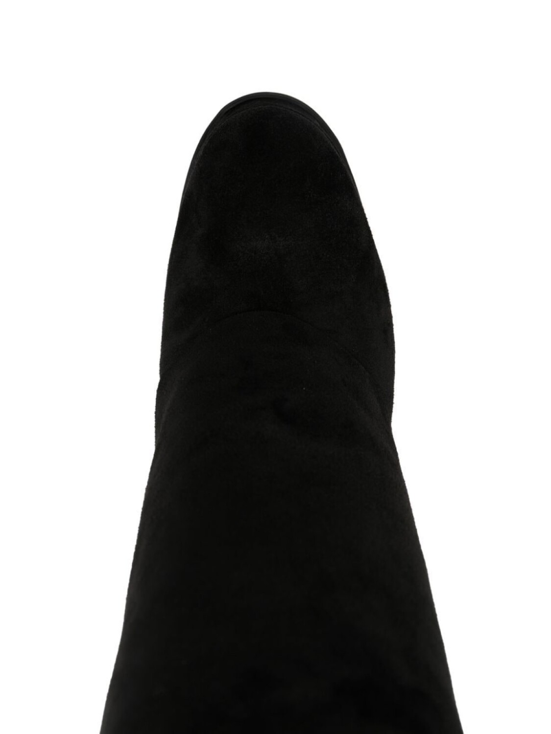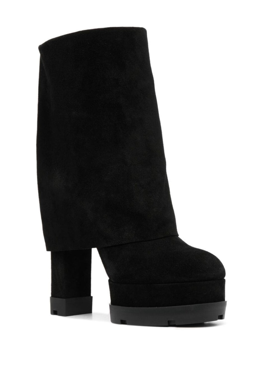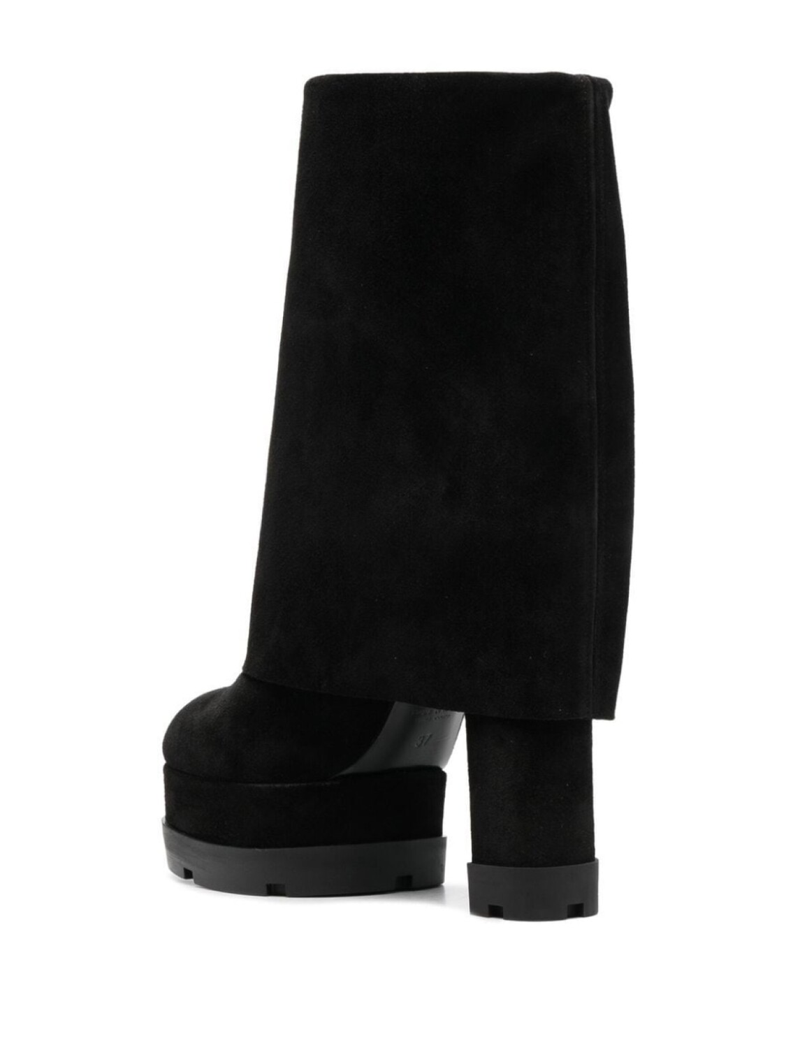 Черный, замша, кожа, закругленный носок, модель без застежки, длина по колено, высокий блочный каблук и рифленая резиновая подошва.