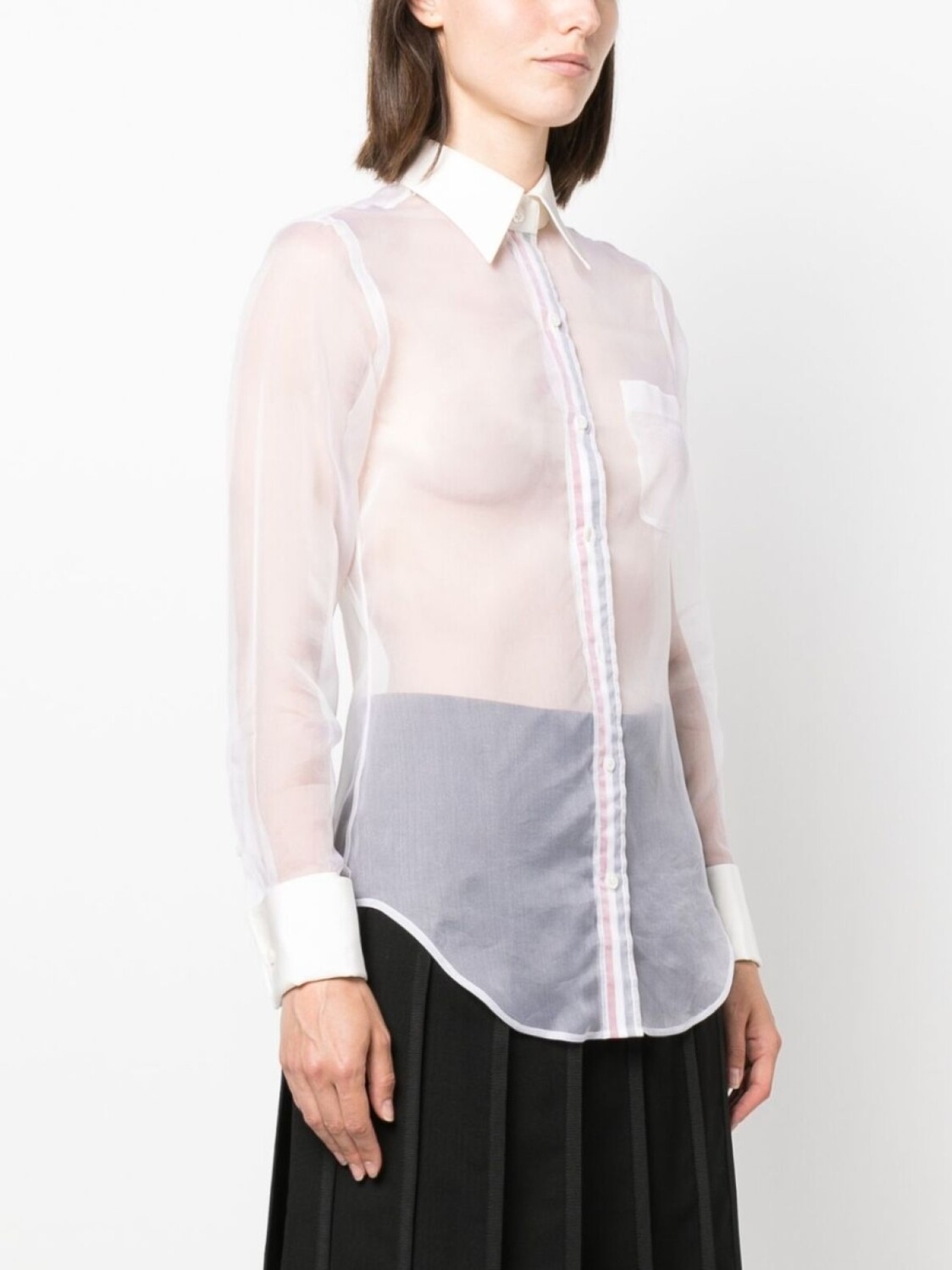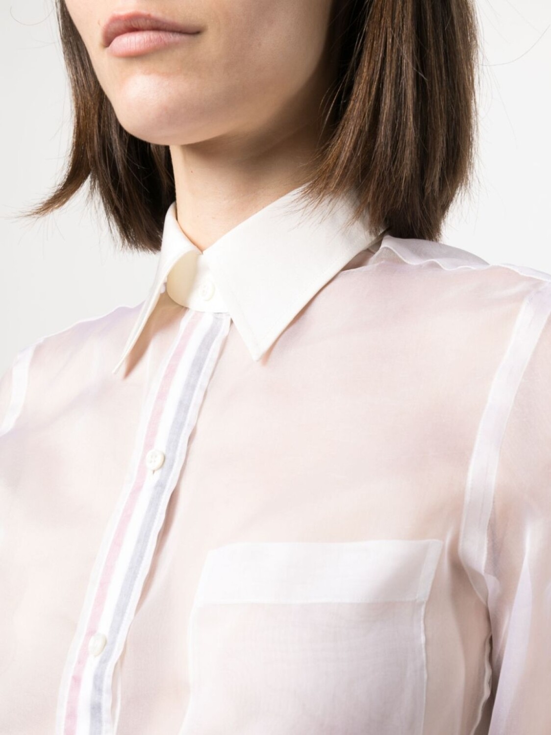 Белый, шелк, прозрачный материал, полоски RWB, плоский заостренный воротник, планка на пуговицах спереди, длинные рукава, манжеты на пуговицах и закругленный подол.