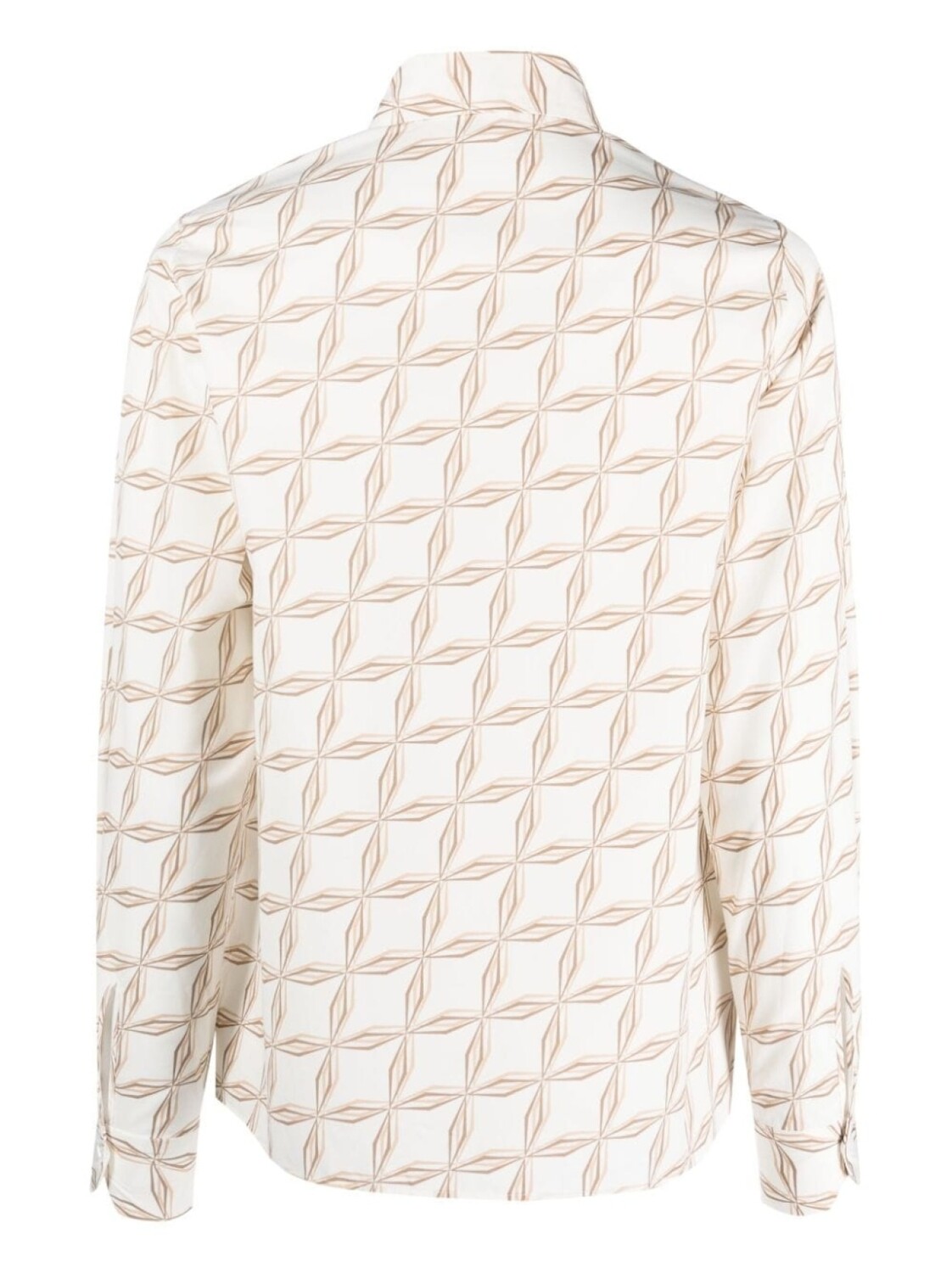 Цвет слоновой кости, песочно-бежевый, коричневый, хлопок, поплин, геометричный принт, отложной воротник, застежка на пуговицах спереди, длинные рукава, манжеты на пуговицах и прямой подол.