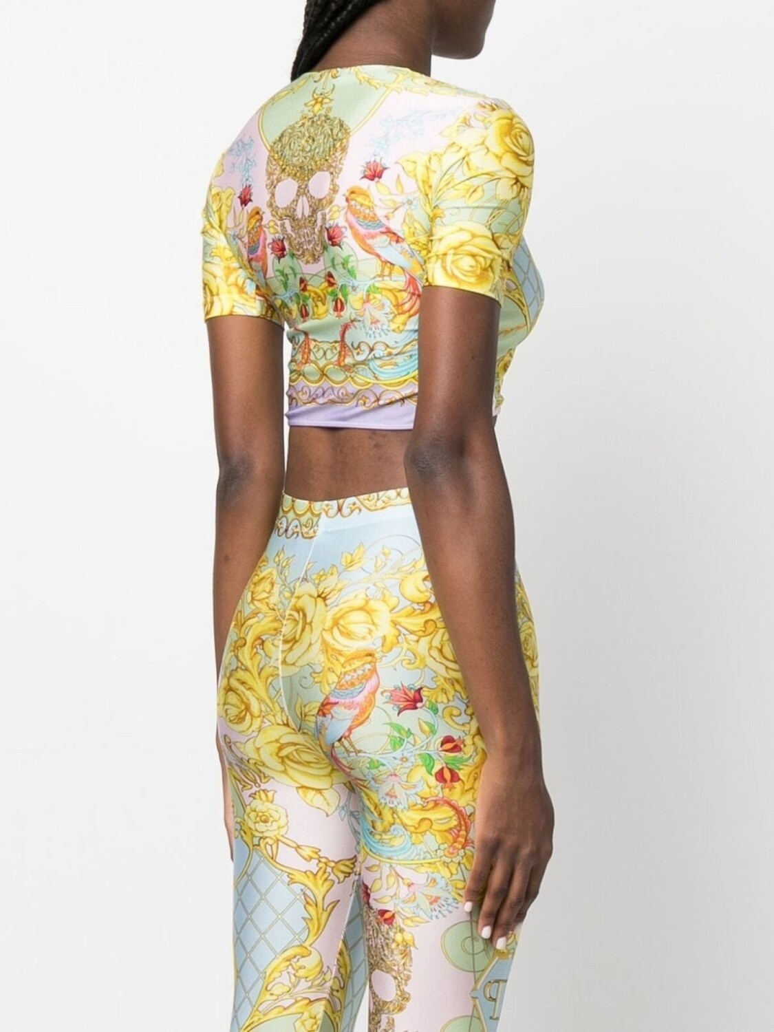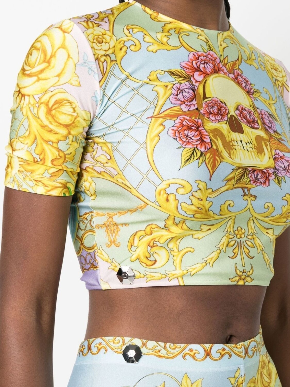 Разноцветный, узор в стиле барокко, принт с изображением черепа спереди, круглый вырез, короткие рукава и укороченная длина.