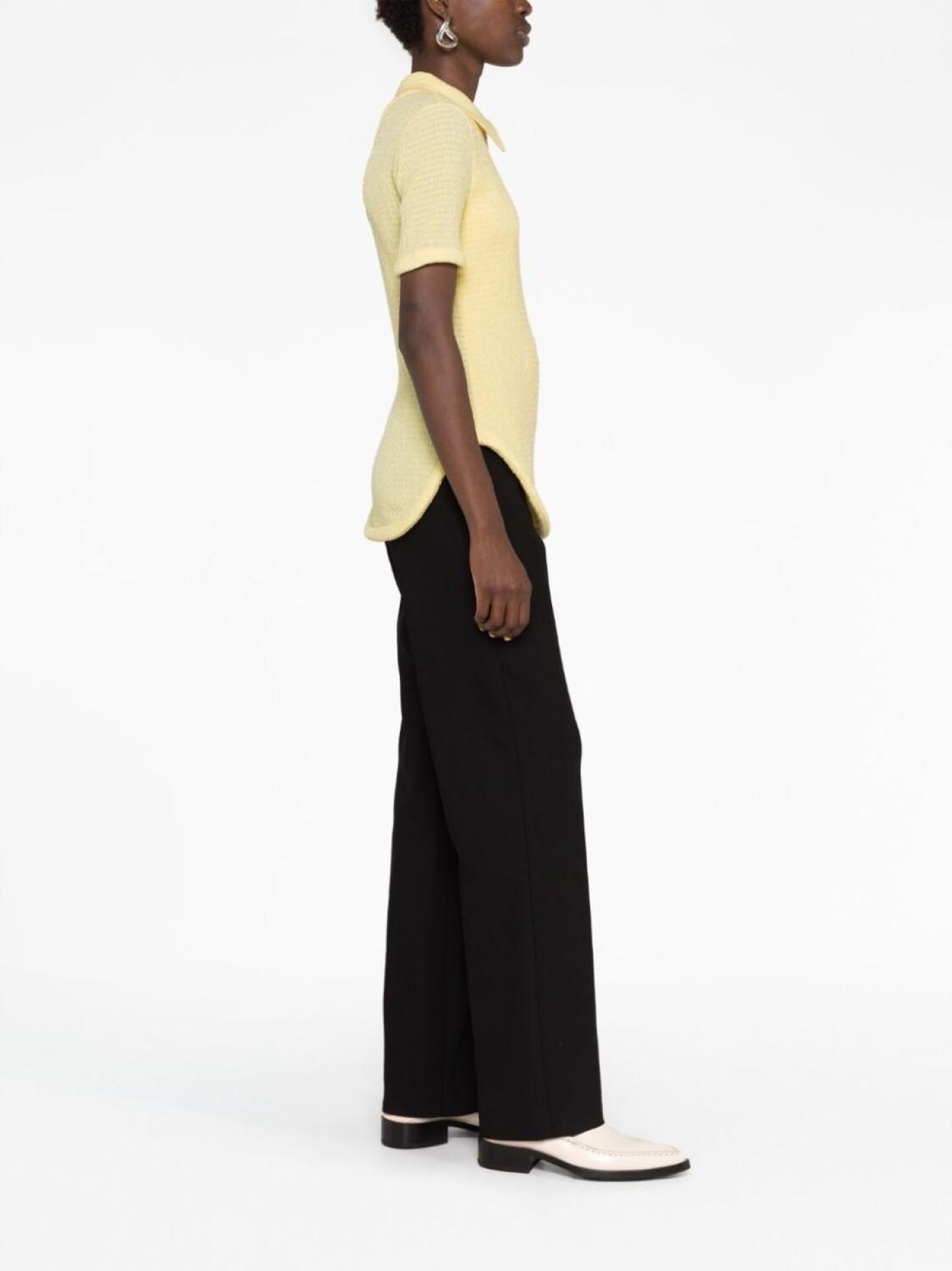 Светло-желтый, фактурная отделка, плоский заостренный воротник, застежка на молнии спереди, короткие рукава и закругленный подол.
