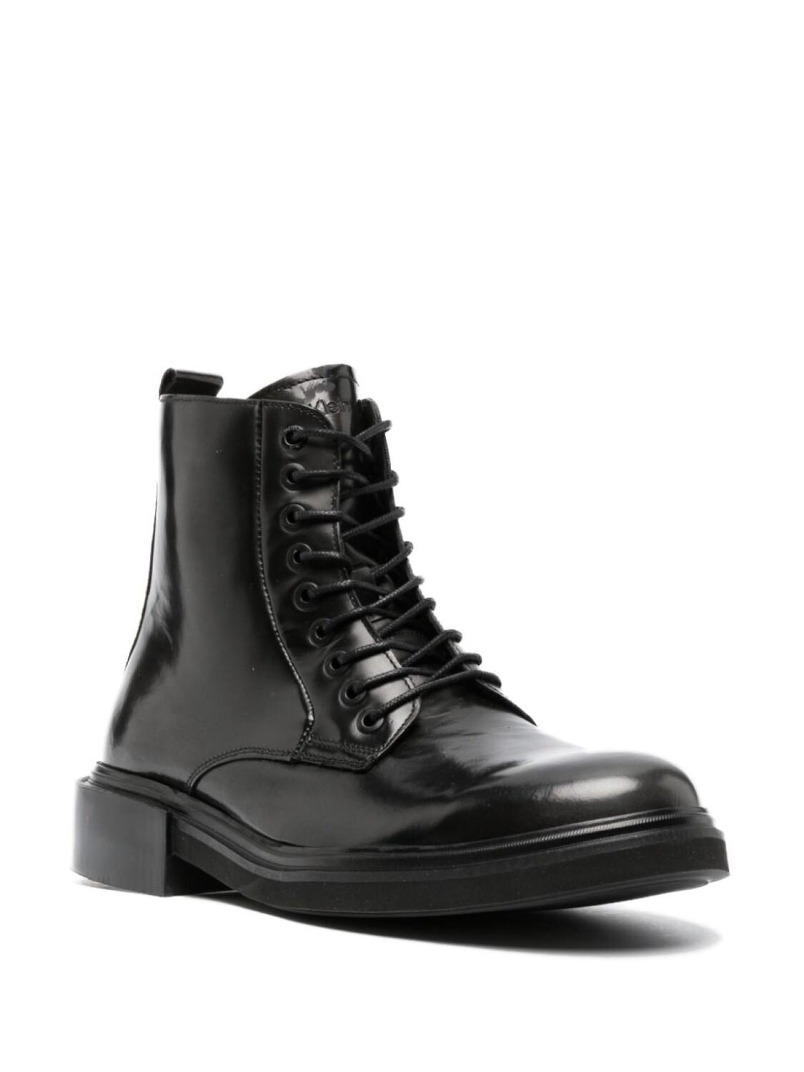 Черный, телячья кожа, глянцевая фактура, закругленный носок, шнуровка спереди, петля для подтягивания сзади и массивная резиновая подошва.