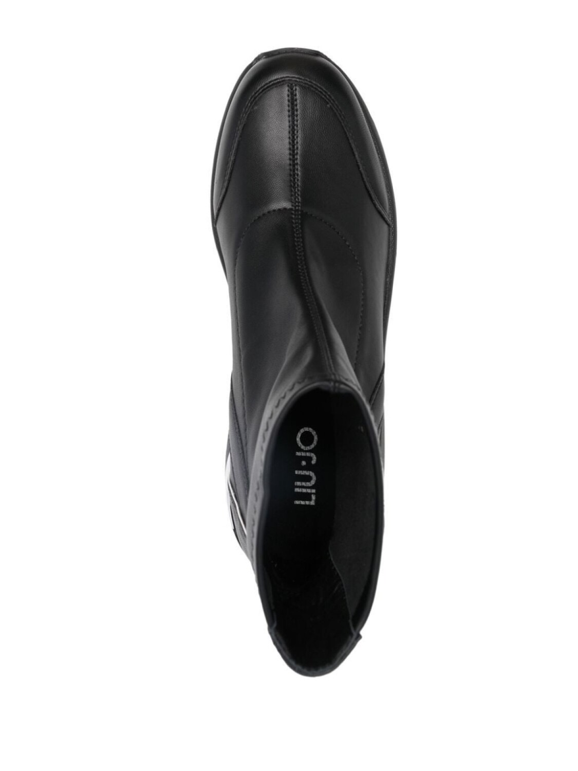 Черный, кожа, высота по щиколотку, серебристый металлический логотип, миндалевидный носок, низкая танкетка и массивная резиновая подошва.