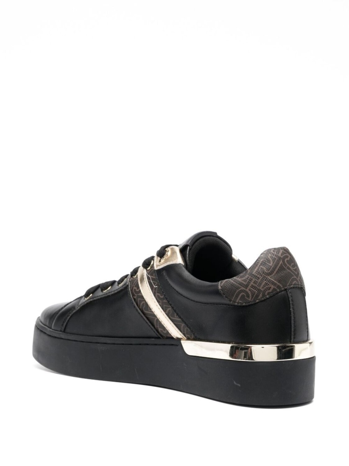 Черный, искусственная кожа, высота по щиколотку, вставки, узор с изображением монограммы, контрастная отделка, шнуровка спереди, петля для подтягивания сзади, застежка на молнии сбоку и плоская резиновая подошва.
