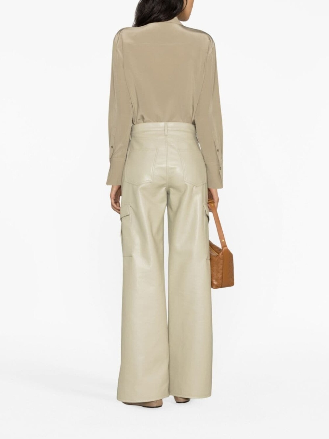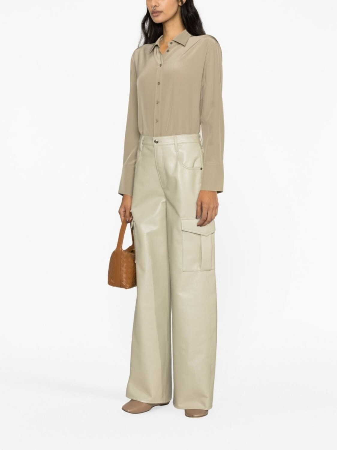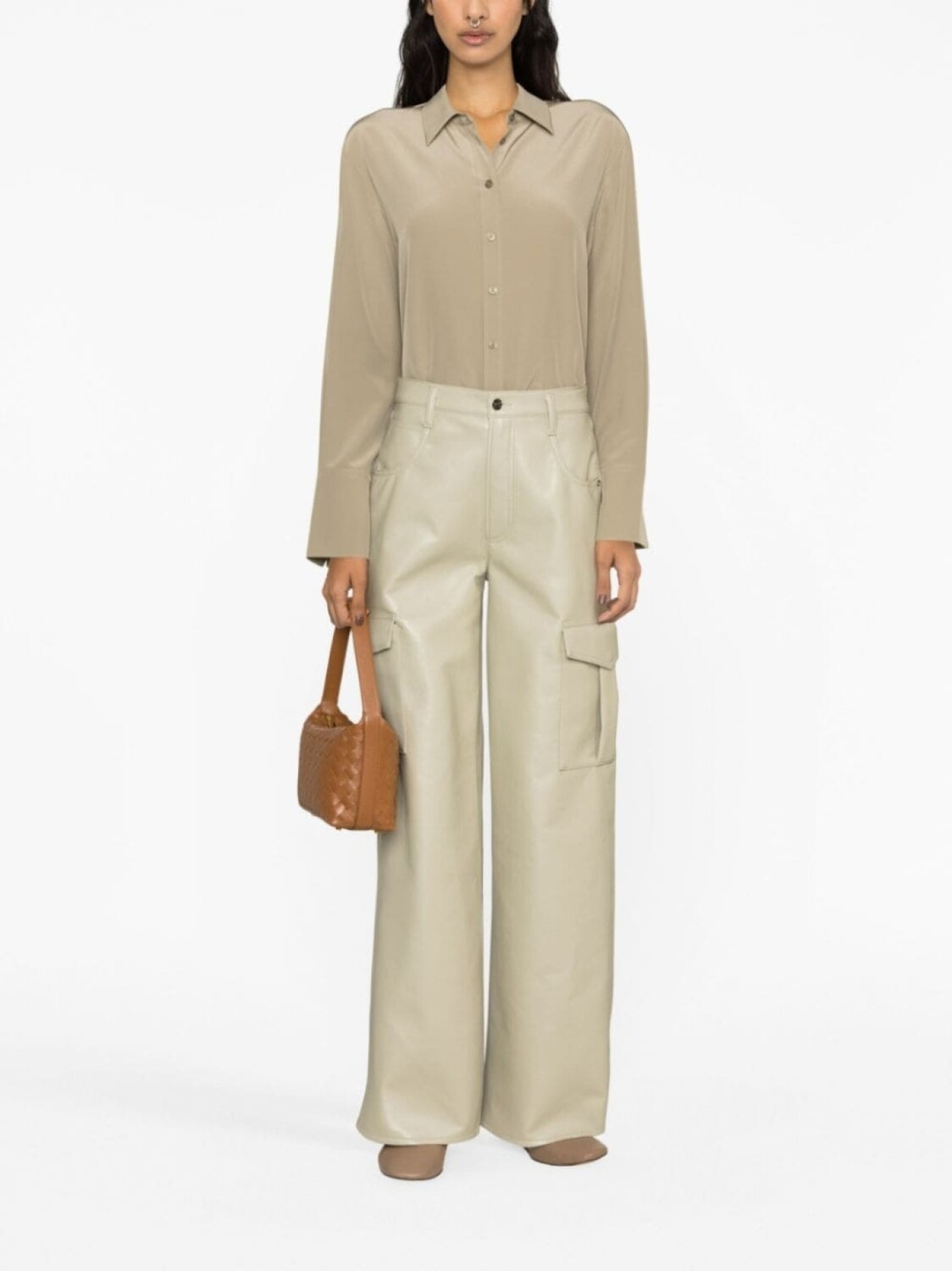 Хаки, шелк, крепдешин, классический воротник, застежка на пуговицах спереди, длинные рукава, манжеты на пуговицах и прямой подол.