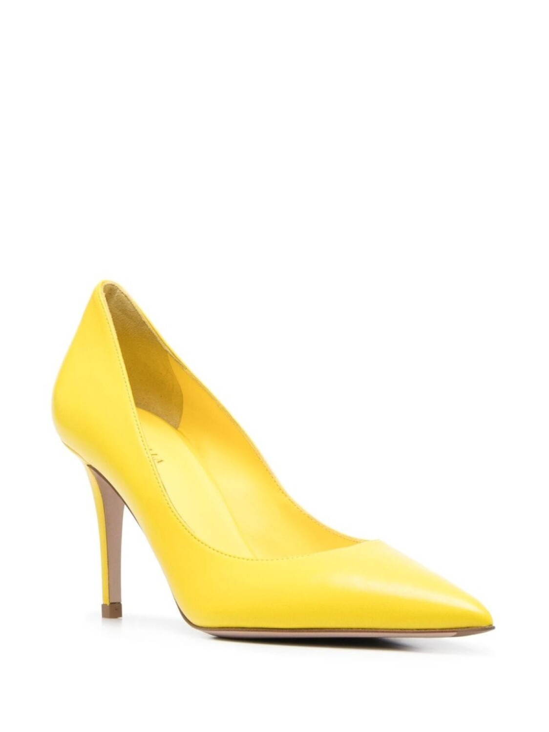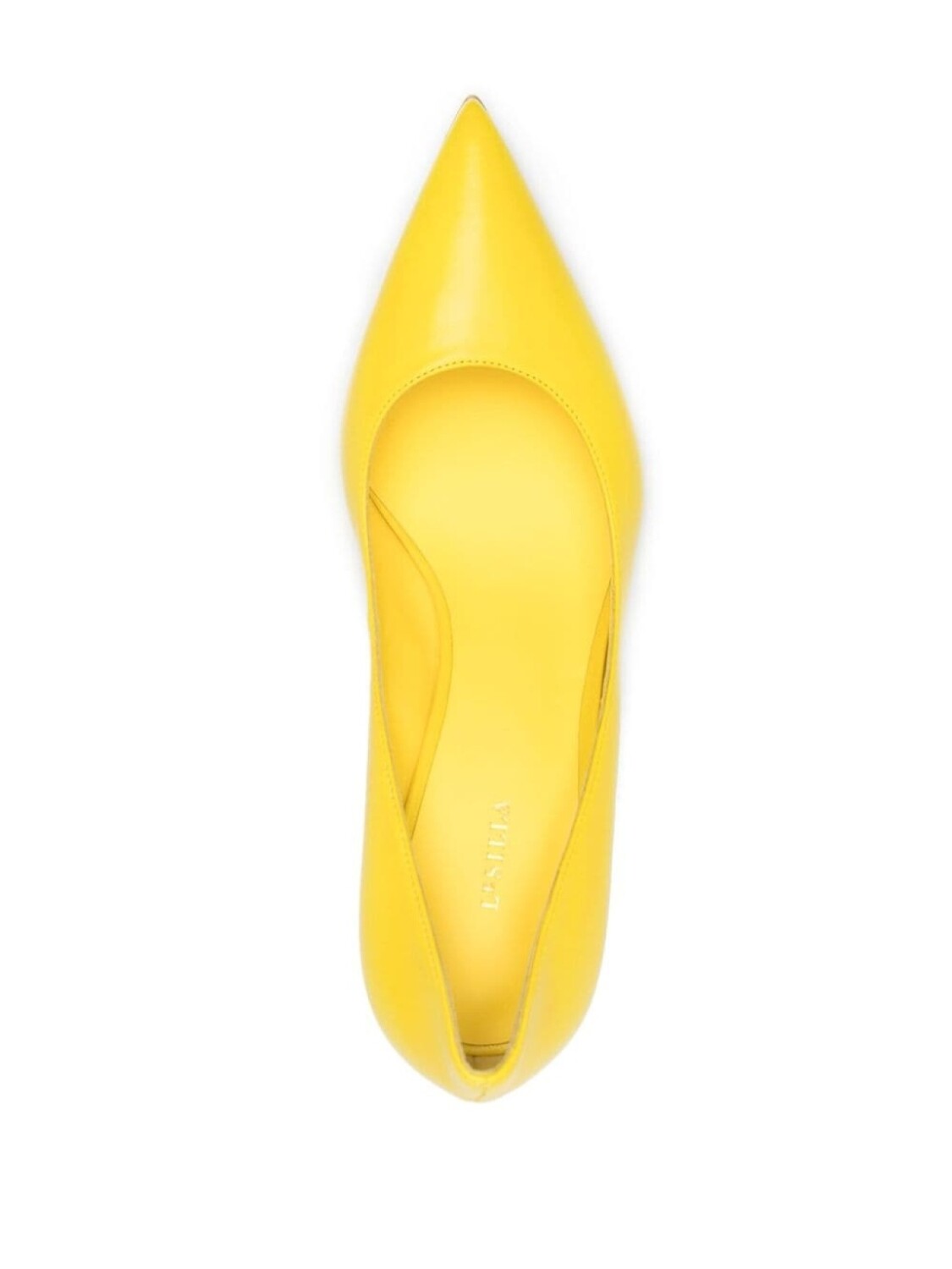 Желтый цитрон, телячья кожа, модель без застежки, заостренный носок и высокий каблук.